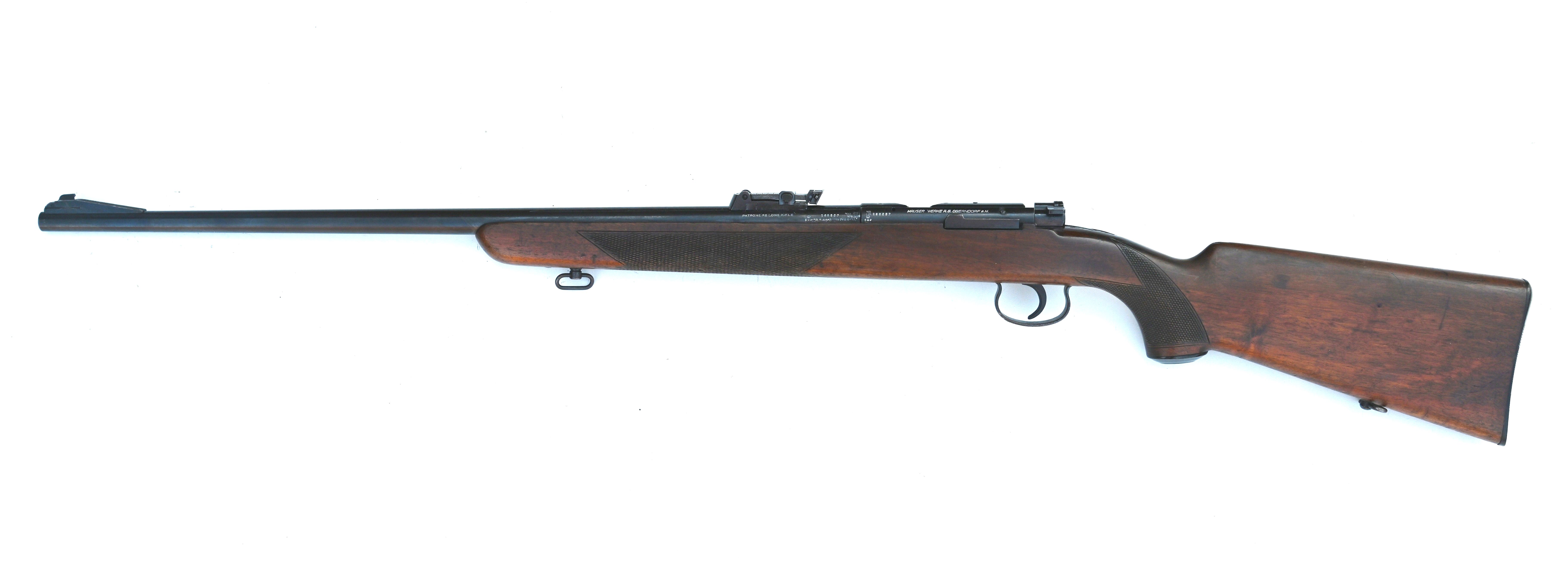 Pre-War Oberndorf Mauser Model ES 350 Bolt Action Single Shot Target Rifle, #1168857, .22 LR cal., 27" barrel, blue finish, smooth walnut one-piece pistol grip stock with sling swivels. Ramped blade front and adjustable military tangent style rear sights, with factory grooved receiver. Factory markings are clear with numerous german proofs and british proofs. Bolt handle is marked with the matching serial number. Barrel is marked "Ch51" with vertical "s", right side is marked, "D.R.P.D.R.G.M." with a standard German period patent mark. Mfgd in the 1930s. Rifle is in very good overall condition, retaining traces of original finish with the remainder drifting to gray patina. Stock is in very good condition with scattered indentations, scuffs, and an coat of varnish. Action functions smoothly. Bore is very good with defined rifling.