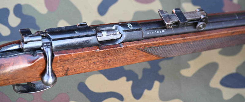 "MAUSER"-Banner auf der Hülsenoberseite. Patenthinweise rechts auf der Laufwurzel "D.R.P. D.R.G.M." = Deutsches Reichspatent, Deutsches Reichs-Gebrauchsmuster.