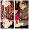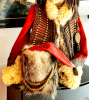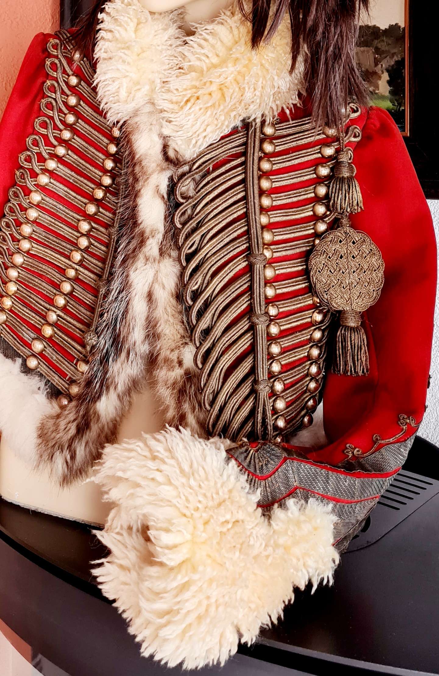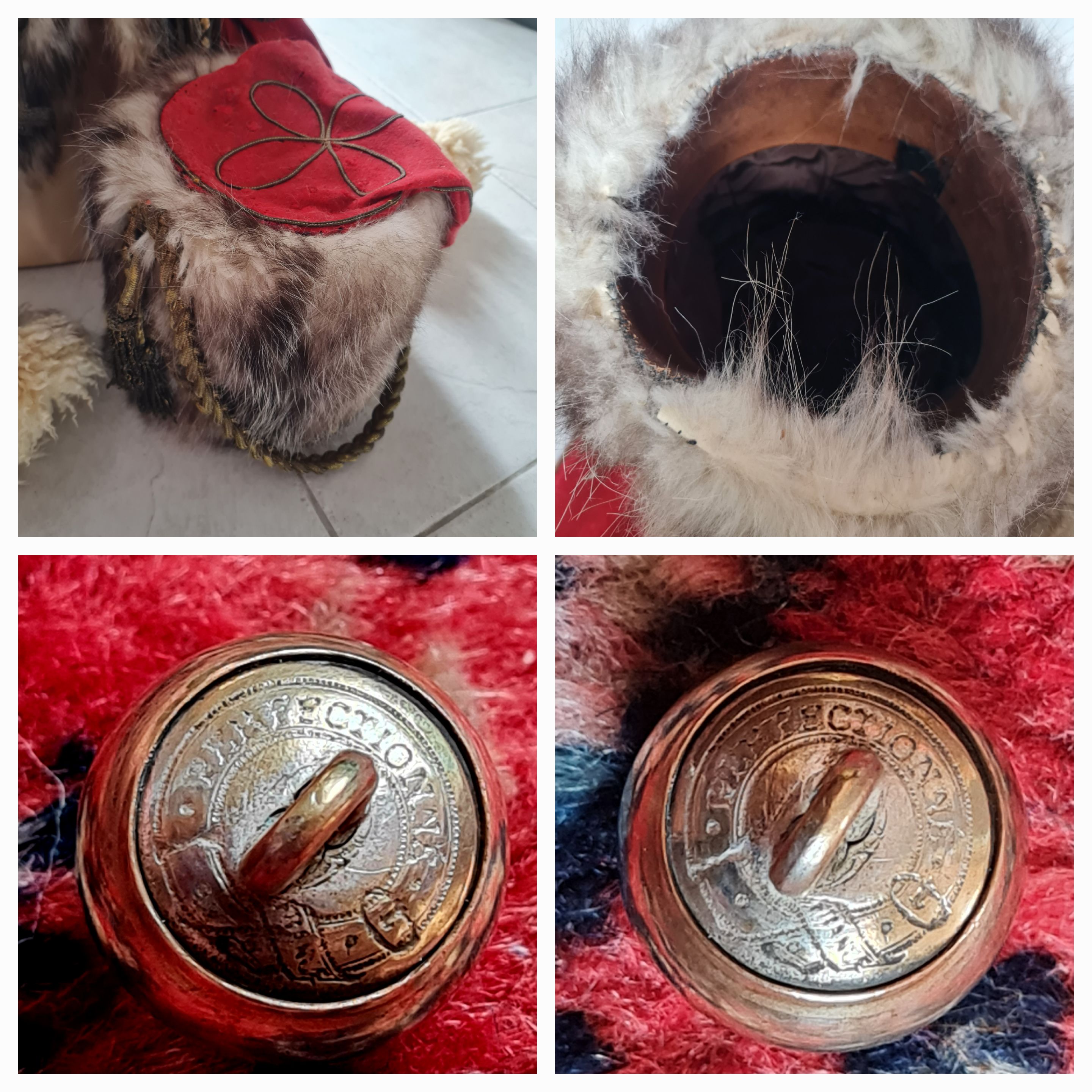 Dolman mit Pelzmütze um 1840 für einen Husarenoffizier. Extrem selten heut kaum noch zu bekommen. Der rote Dolman mit silber Verschnürung, Silbertresse und Fellbesatz. Dazu die Pelzmütze mit Fangschnur und rotem Kolpak. Die Knöpfe hinten mit Hersteller in der Gürtelschlaufe "France" und Umlaufend "Perfectional". Der Pelzbesatz wurde wohl nach den Jahren erneuert. Es wurde Schaf und Opossum verwendet. Beim Opossum gibt es zum Teil Mottenschäden. Der Dolman sehr gering und nur am Opossum, (siehe Pfeile) die Mütze stärker. Der Kolpak Orginal jedoch mit Ausbesserrungen. Lederband Orginal, Innenfutter ergänzt. Insgesamt ist die Erhaltung gut und die Schäden können mit etwas Aufwand ausgebessert werden. Versand außerhalb Deutschlands auf Anfrage. Kein Verkauf an Mitglieder unter 5 positiven Bewertungen. Privatverkauf daher keine Garantie, Gewährleistung oder Umtausch nach EU Recht für Gebrauchtwaren.