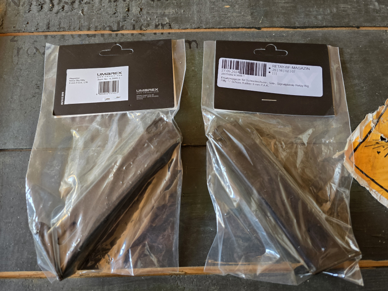 Zum Verkauf kommt hier ein Magazinset bestehend aus zwei Magazinen für die Schreckschusswaffe Retay Big Fifty in 9mm P.A.K.
