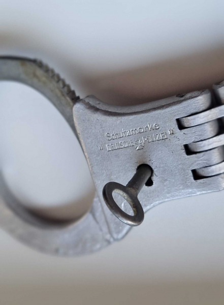 Aus einer alten Sammlung: RAR! Original Polizeihandschellen „Deutsche Polizei“ (Schutzmarke), massives Scharniermodell mit Schlüssel – so heute nur noch selten zu finden.
