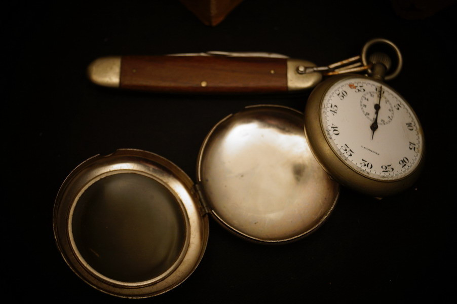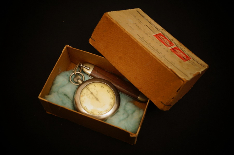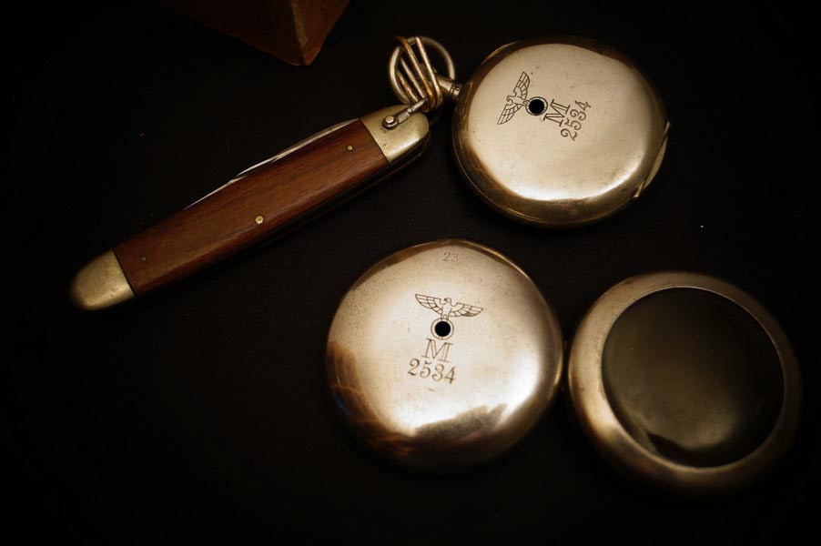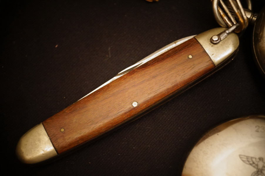 Aus dem Nachlass wo auch der Dolch in vorheriger Auktion kommt. So in Schachtel verpackt gewesen. Uhr, defekt aber mit Schutz und dem Taschenmesser.