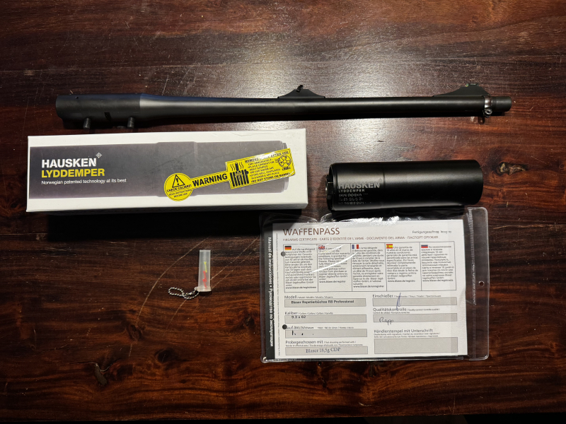 Verkauft wird ein original Blaser R8 Nachsuche Lauf, im Kaliber 9,3x62, sowie ein passender „On Barell“ Schalldämpfer der Firma Hausken (Modell SK156).