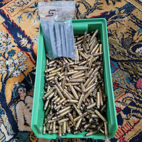 Sie bieten hier auf 1.100 Stück Geco-Hülsen .223. Sie wurden 1x in einem Indoor-Schießstand abgefeuert. Es liegen auch noch 50 Original-Ladestreifen bei. Die Box und der Teppich sind nicht Bestandteil des Angebotes. Hülsen und Ladestreifen siehe Foto. Dies ist ein Privatverkauf. Daher keine Rücknahme, keine Gewährleistung, keine Garantie, kein Ersatz. Beachten Sie bitte meine weiteren Angebote.