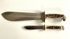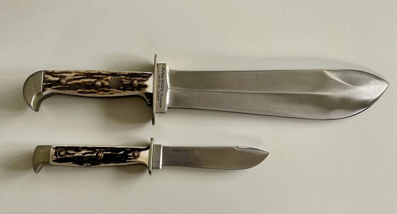 Ich möchte mich von einem rarem, sehr frühen Waidbesteck aus den 50er Jahren trennen. Für das Alter in einem sehr schönem Zustand. Es befindet sich im Fundzustand. Wer möchte kann es an einigen Stellen (Griff) polieren oder den Grünspan entfernen. An der Scheide hat sich an der Rückseite ein Faden leicht gelöst, dem Alter geschuldet. Dürfte auch kein Problem darstellen. Die Klingen scheinen meiner Ansicht nach nicht geschliffen worden zu sein. Aber beurteilt das bitte selber. Keine Zusage von mir. Der Clou ist jedoch die Adelskrone auf der Monogamplatte! Es handelt sich um eine neunzackige Krone, die für den Grafenstand verwendet wurde. Leider konnte ich die ursprüngliche Herkunft nicht ermitteln. Ein Waidbesteck aus dieser frühen Fertigung in dem angebotenen Zustand dürfte nicht so einfach zu finden sein. Fragen bitte vorher stellen!
