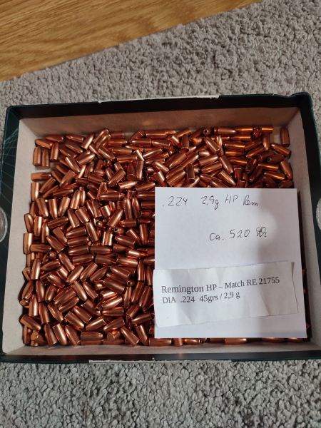 Ich muss aufräumen. Sie bieten auf ca. 520 Geschosse .224 45grs HP Match Remington für .22 Hornet. Die Menge wurde über das Gewicht (1,57kg) bestimmt. Bitte beachten Sie auch meine anderen Auktionen und mein myGun.
