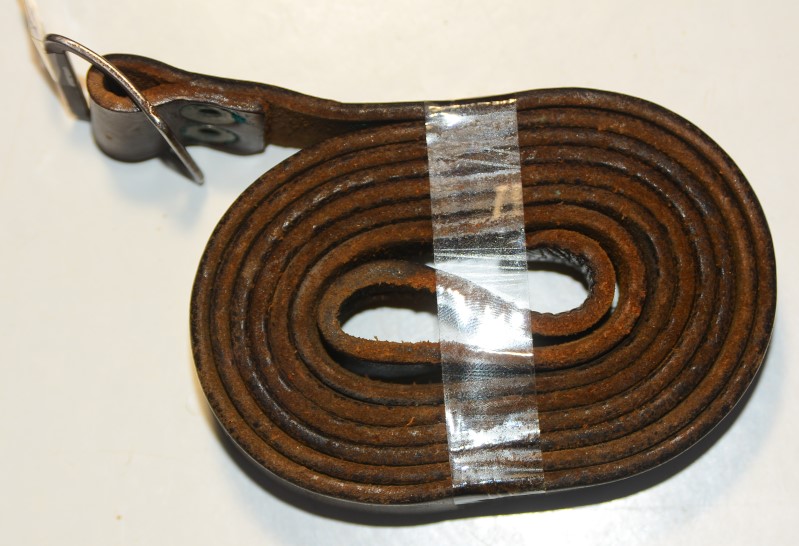Alter Gewehrriemen, wohl aus den 1960er Jahren, 1,39 m lang und 2,3 cm breit. Nicht dabei ist das kurze Riemenstück bis zum Versteller
