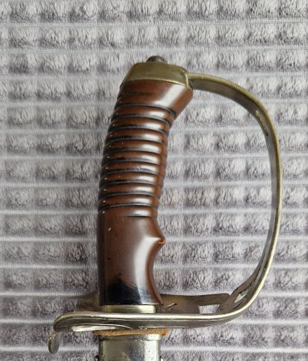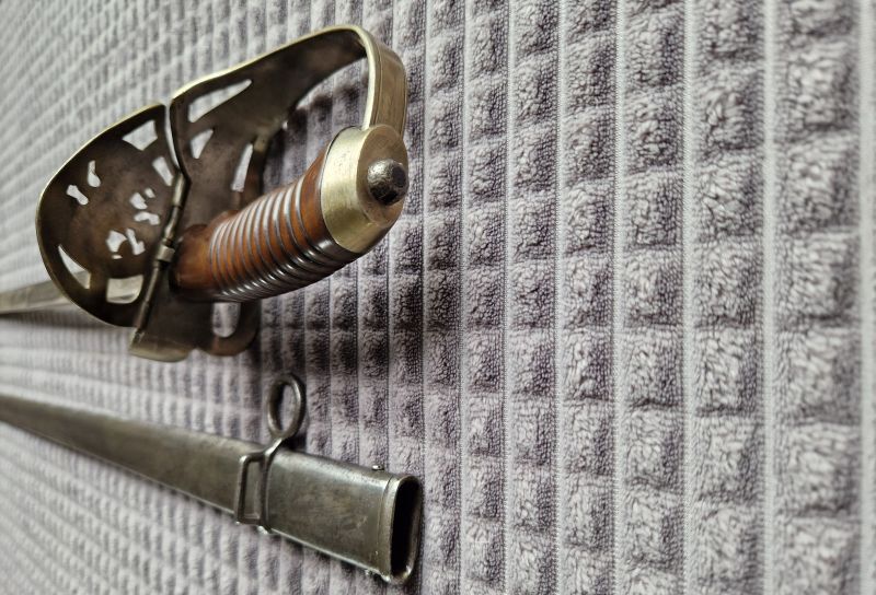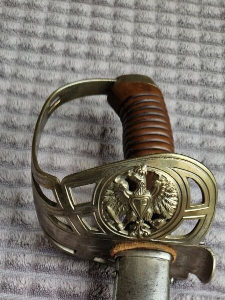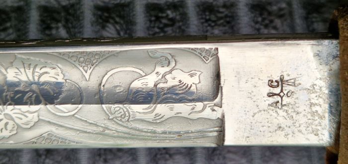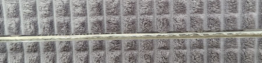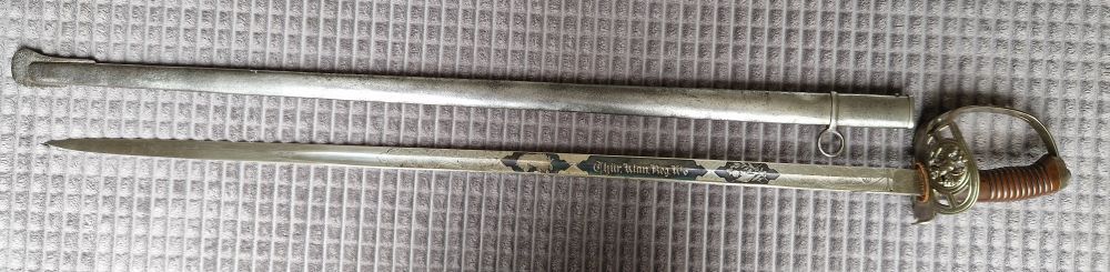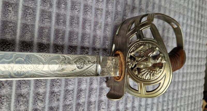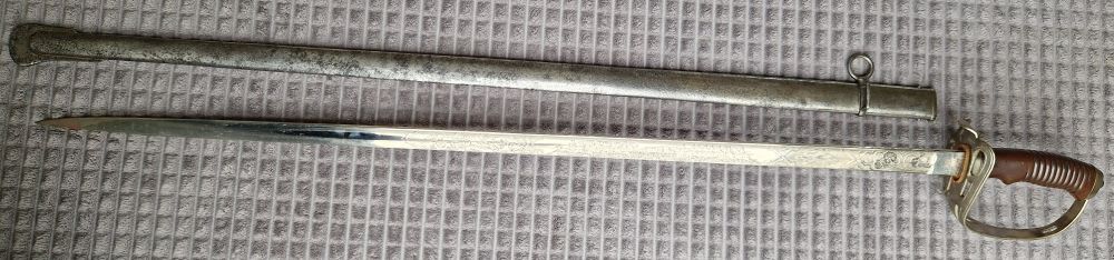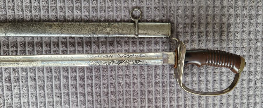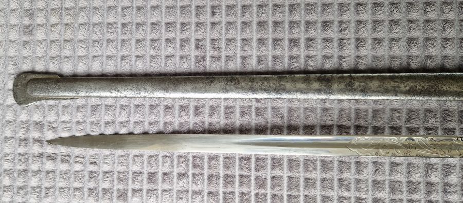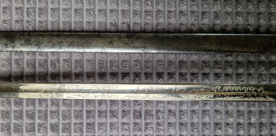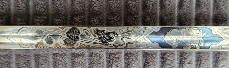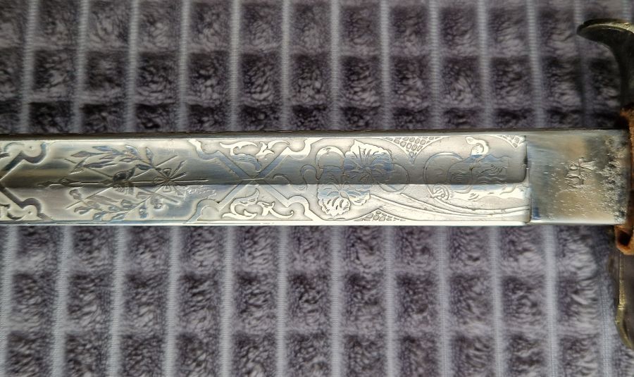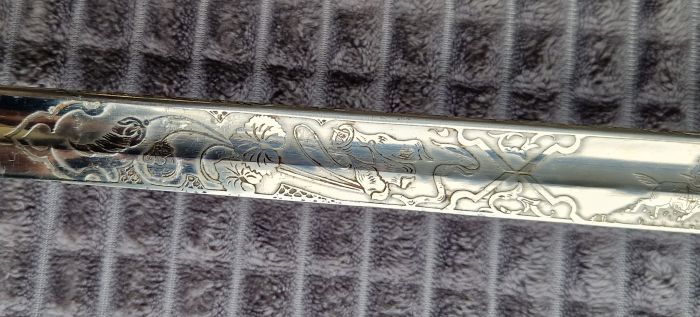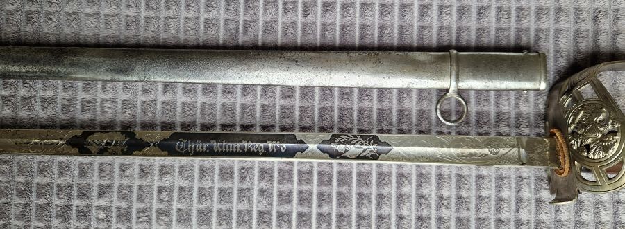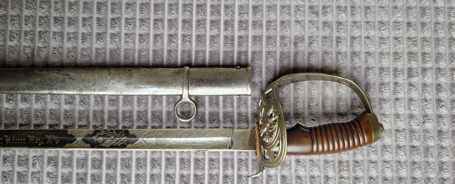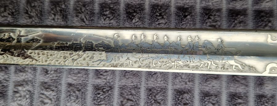 Rückenklinge beidseitig gekehlt. Fein geätzt mit Regimentsbezeichnung, Zierrat, gekreuzte Lanzen, Pferd im Halbrelief usw.