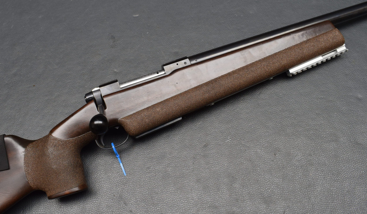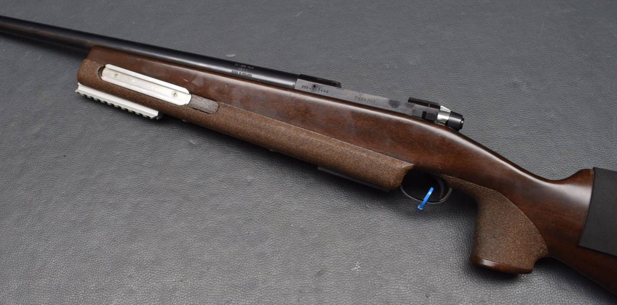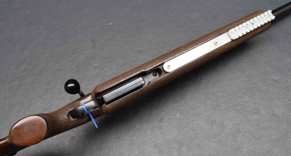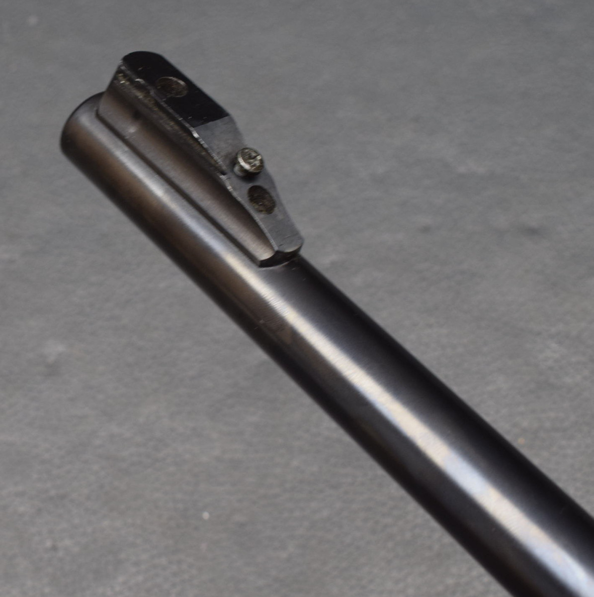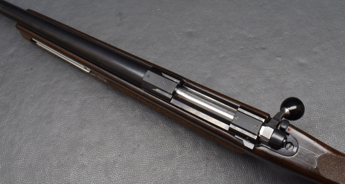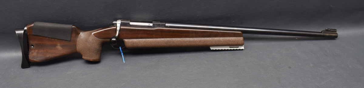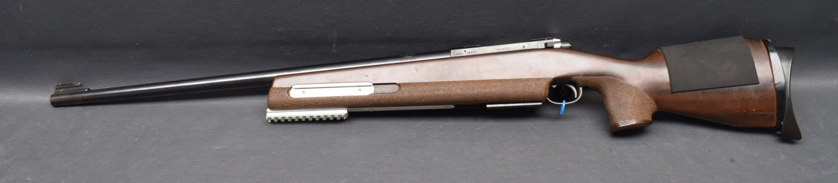 19 mm dicker Lauf, 15 mm Schiene, Ohne Visierung, Zylinderverschluss, seitliche Sicherung, Direktabzug, 6-Schuss Magazin. Nussbaumschaft mit verstellbarer Schaftkappe, 11mm UIT Schiene/Weaverschiene. Lauf sehr gut, Brünierung 96%, Schaft mit Gebrauchsspurren, Gebrauchtwaffe gut