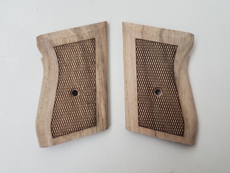 Die Griffschalen haben ein klassisches Lasermuster drauf. Sie sind unversiegelt auf der Oberfläche, damit der Nutzer die Griffschalen nach seinem eigenen Wunsch färben (beizen), ölen oder wachsen kann.