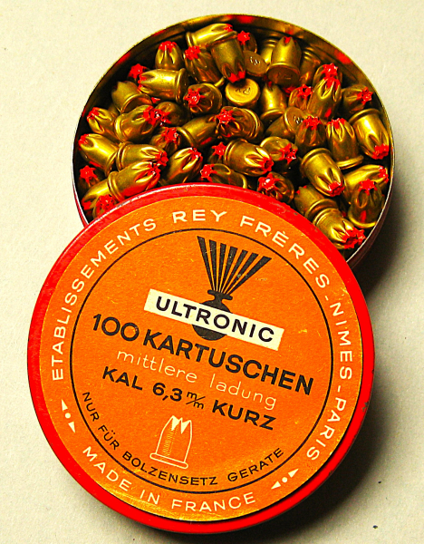 Aus einer Sammlungsauflösung wird eine Dose "Ultronic" mit 100 Kartuschen im cal. 6,3 mm kurz angeboten. Sie haben eine mittlere Ladung. Die Dose mit den Kartuschen ist in einem sehr gutem Zustand. Herstellung war bei Etablissements Rey Freres- Nimes- Paris in Frankreich. Sie sind nur für Bolzenschubgeräte vorgesehen. Die Bilder sind Bestandteil der Auktion. Dieses ist ein Privatverkauf, daher keine Garantie oder Rücknahme. Bitte beachten sie auch meine anderen Angebote.
