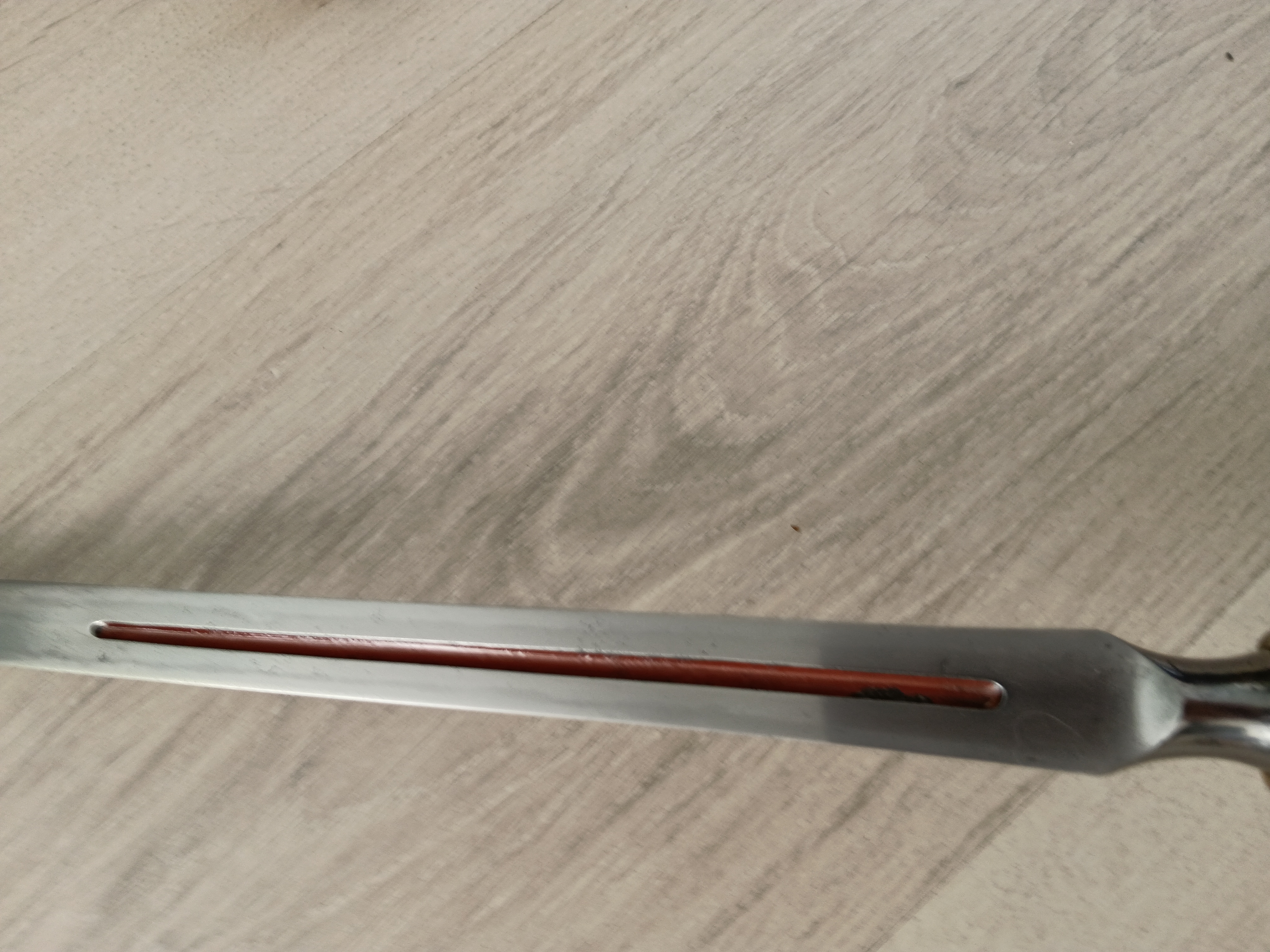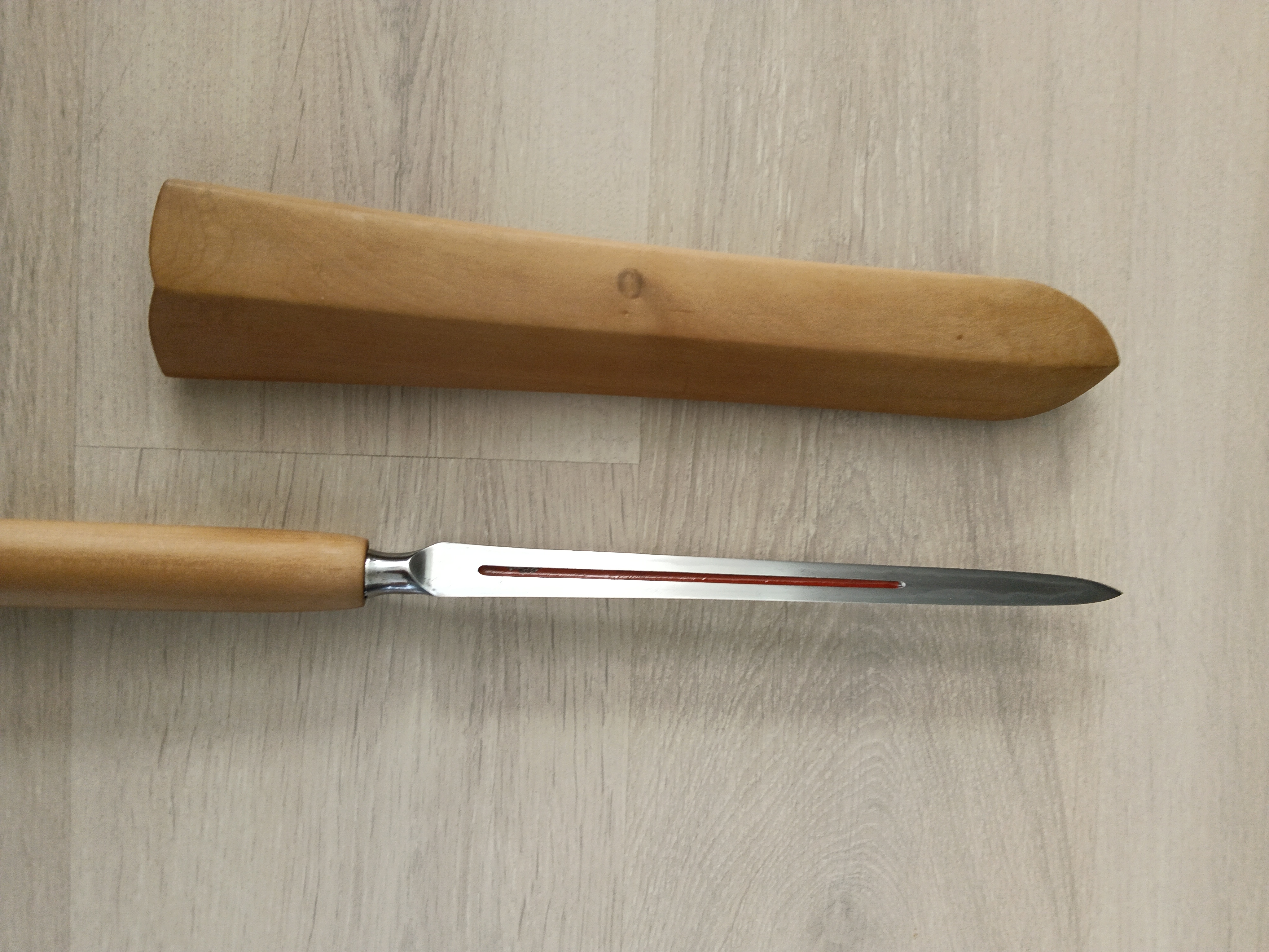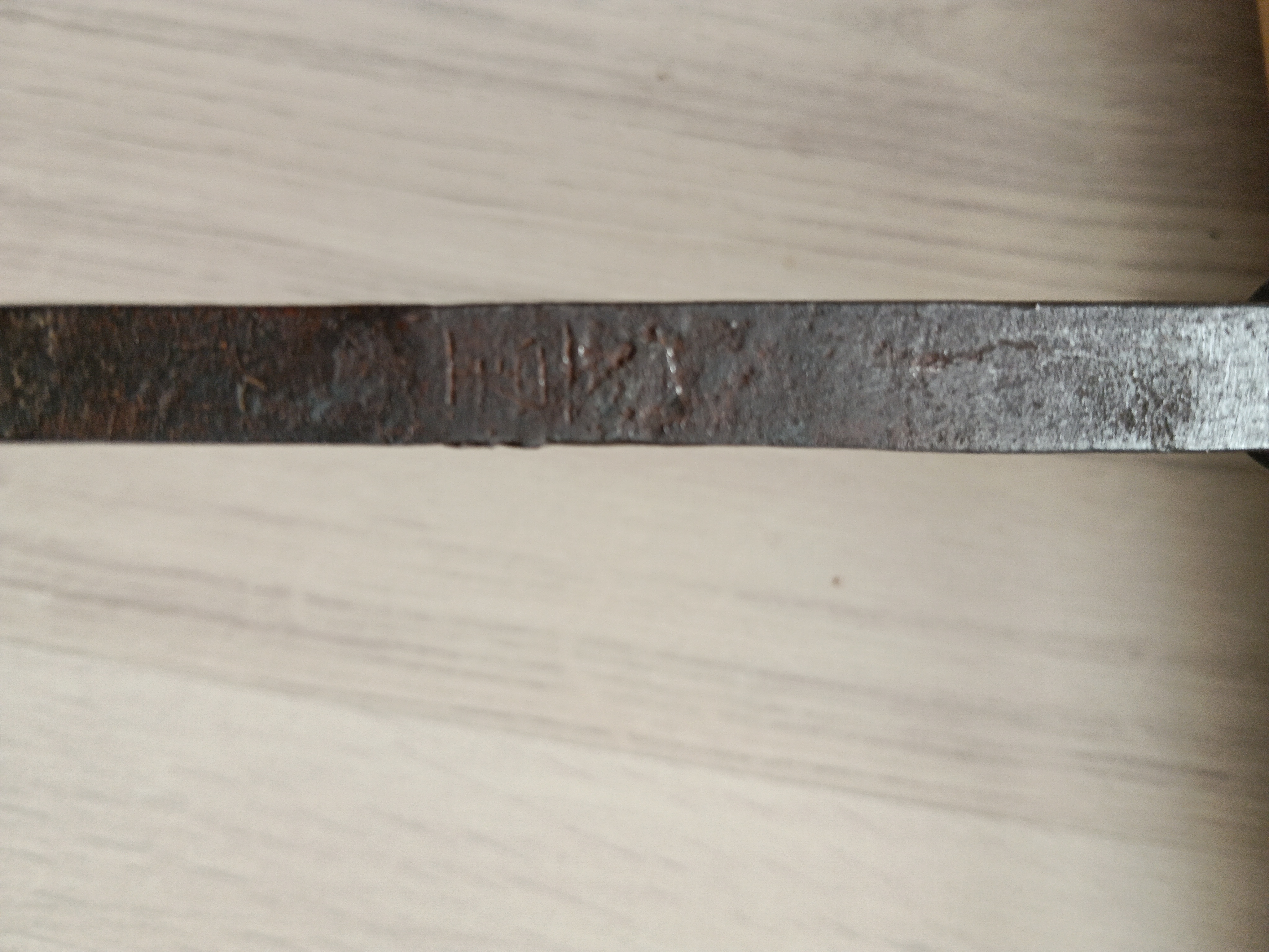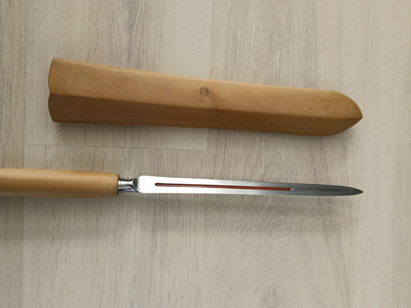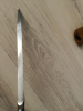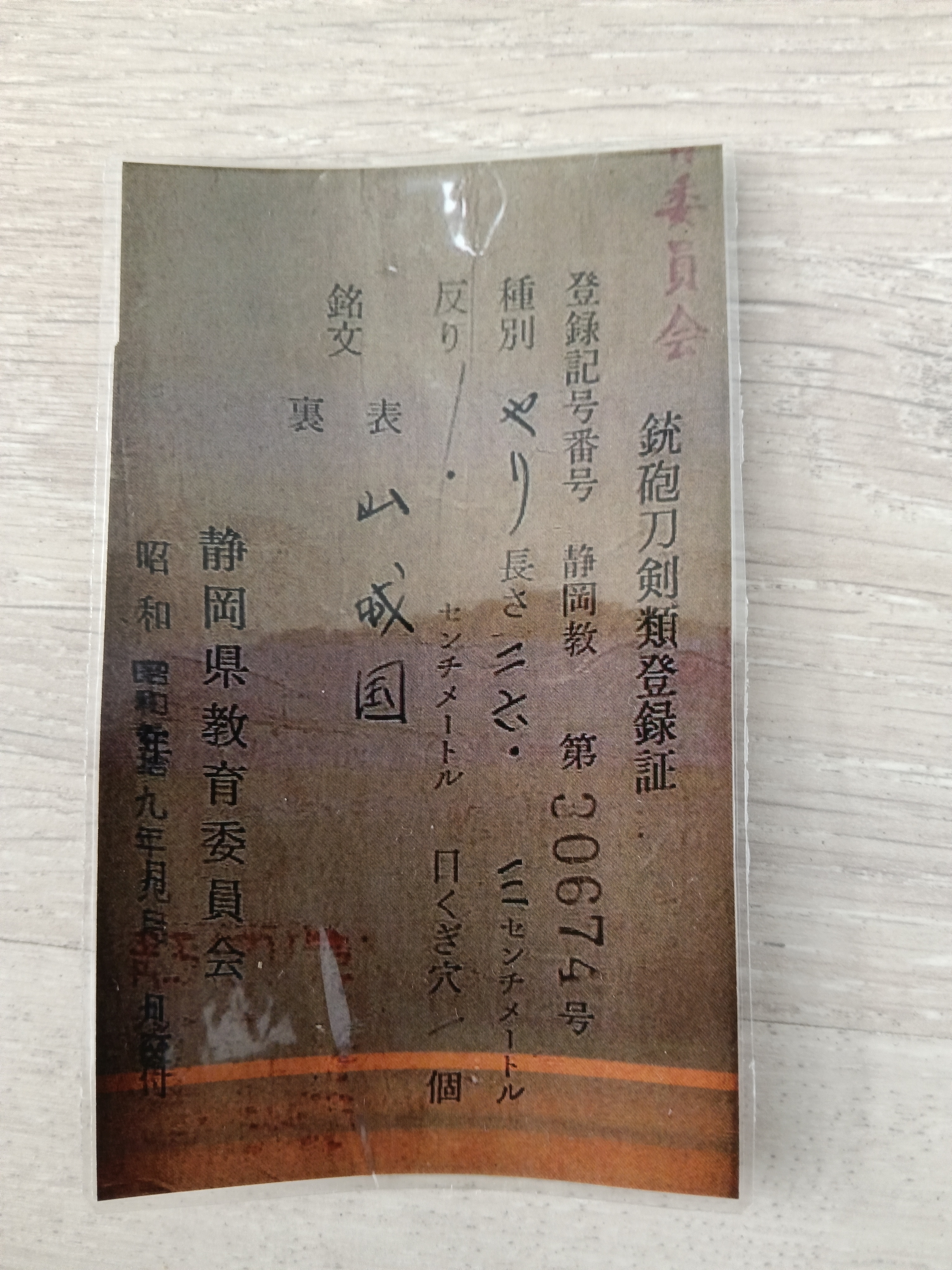 Antieke Japanse speer (sankaku yari 三角槍, "driehoekige speer" ) in shirasaya . Nakago is gesigneerd " Yamashiro ...kuni ...", maar niet volledig leesbaar. Een sankaku yari had een punt die leek op een smalle stekel met een driehoekige doorsnede. De sankaku yari was het beste geschikt om pantser te doorboren, zelfs pantser van metaal, waar een standaard yari minder geschikt voor was. Heel goede verzamel staat, blade lengte 26.5 cm, blaad breedte 2.7 cm, totale lengte in shirasaya 84.5 cm. Kopie van torokuscho inclusief.