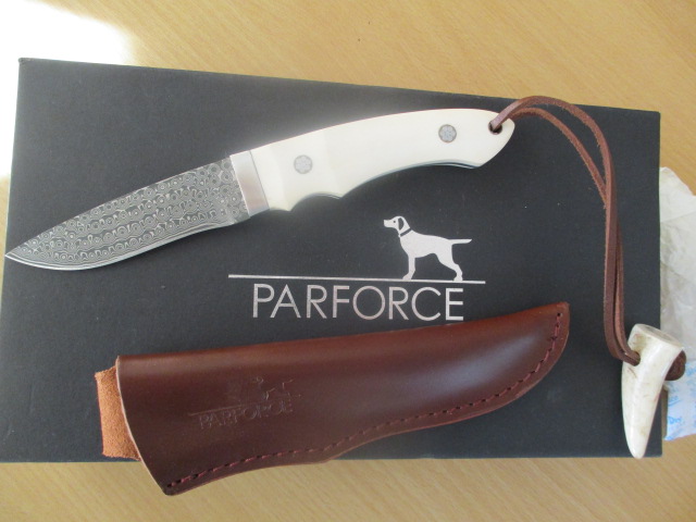 Verkaufe aus Nachlass Messersammlung ein Damast Jagdmesser von Parforce mit einer Klinge von 9cm und einer Gesamtlänge von ca. 20cm. Das Messer ist Neu und war OVP mit Hülle und Box. Hab es nur fürs Foto kurz ausgepackt.