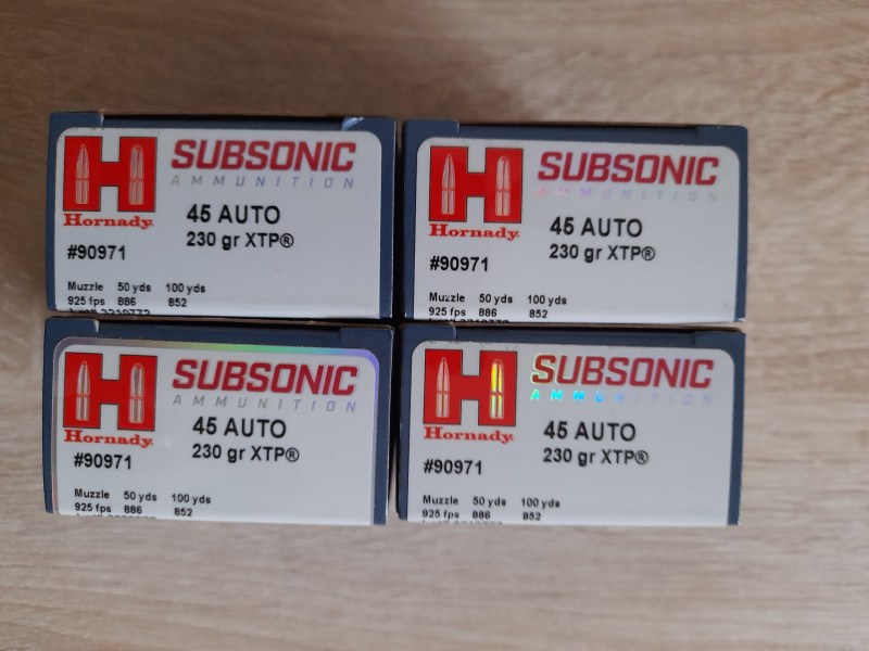 Hallo, ich verkaufe 4 x Packungen a` 20 Schuss = 80 Patronen Kaliber .45 ACP Subsonic mit einem 230 gr. XTP Geschoss.