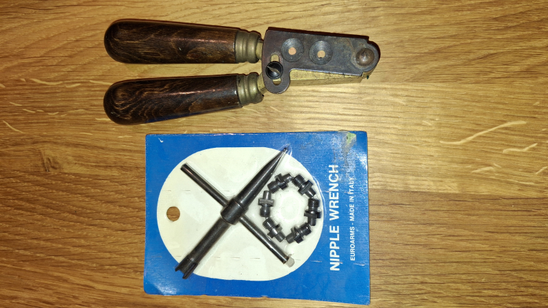 Aus Nachlass eine Gußzange Cal. 36 und ein Set Nipple Wrench.
