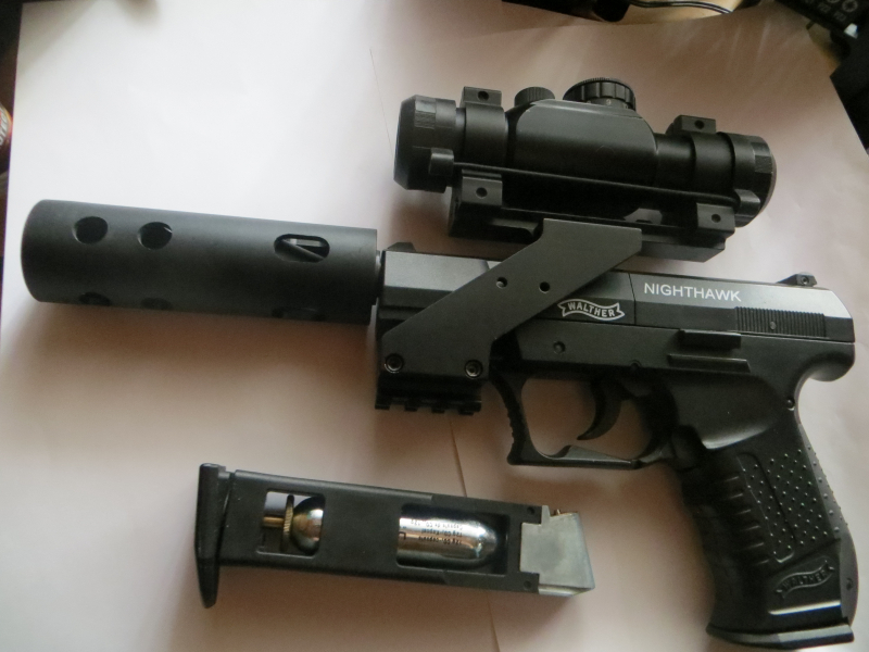 Ich biete eine neuwertige co2 Waffe "Walther Nighthawk" zum verkauf an. Waffe im original Koffer mit Bedienungsanleitung, 2 Trommel-