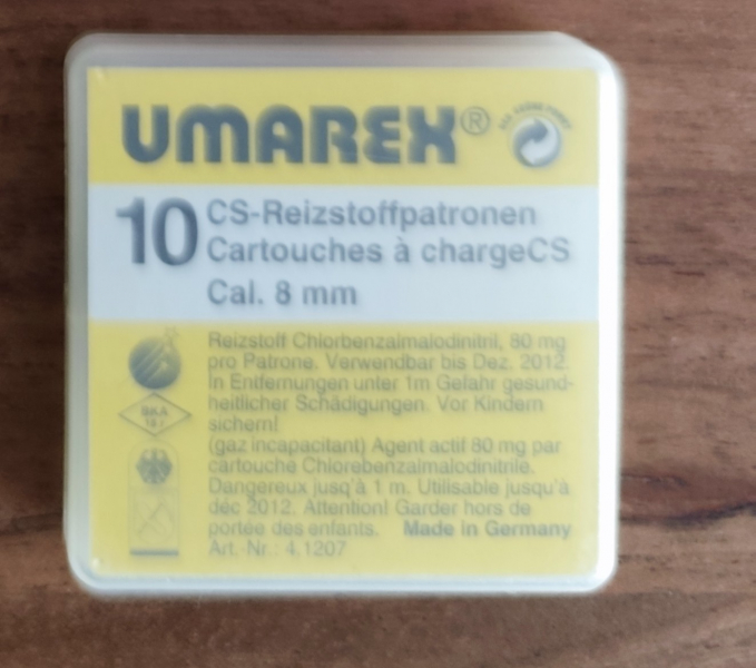CS Gas Patronen von der Firma UMAREX – 10 Stück pro Packung Zum Verkauf stehen 10 CS Gas Patronen im Kaliber 8mm Schreckschuss Munition. Jede Patrone enthält 80 mg Ortho-Chlorbenzalmalondinitril, was eine sehr starke Ladung darstellt. Aufgrund des MHDs von 2012 sind diese Patronen besonders stark geladen. Die Patronen befinden sich in einem Sammlerbestand, wurden trocken gelagert und funktionieren einwandfrei.Die Bilder sind Bestandteil der Artikelbeschreibung. Verkauf nur an Personen 18+ Altersnachweis erforderlich. Versandkosten: 5,90€ (Verpackung und Versand). Privatverkauf Keine Garantie, keine Rücknahme!