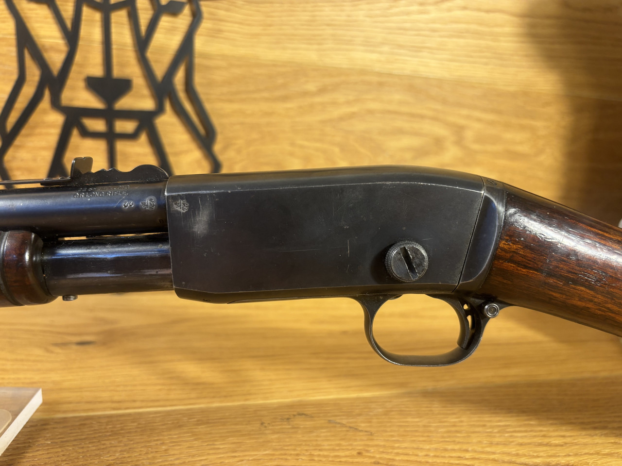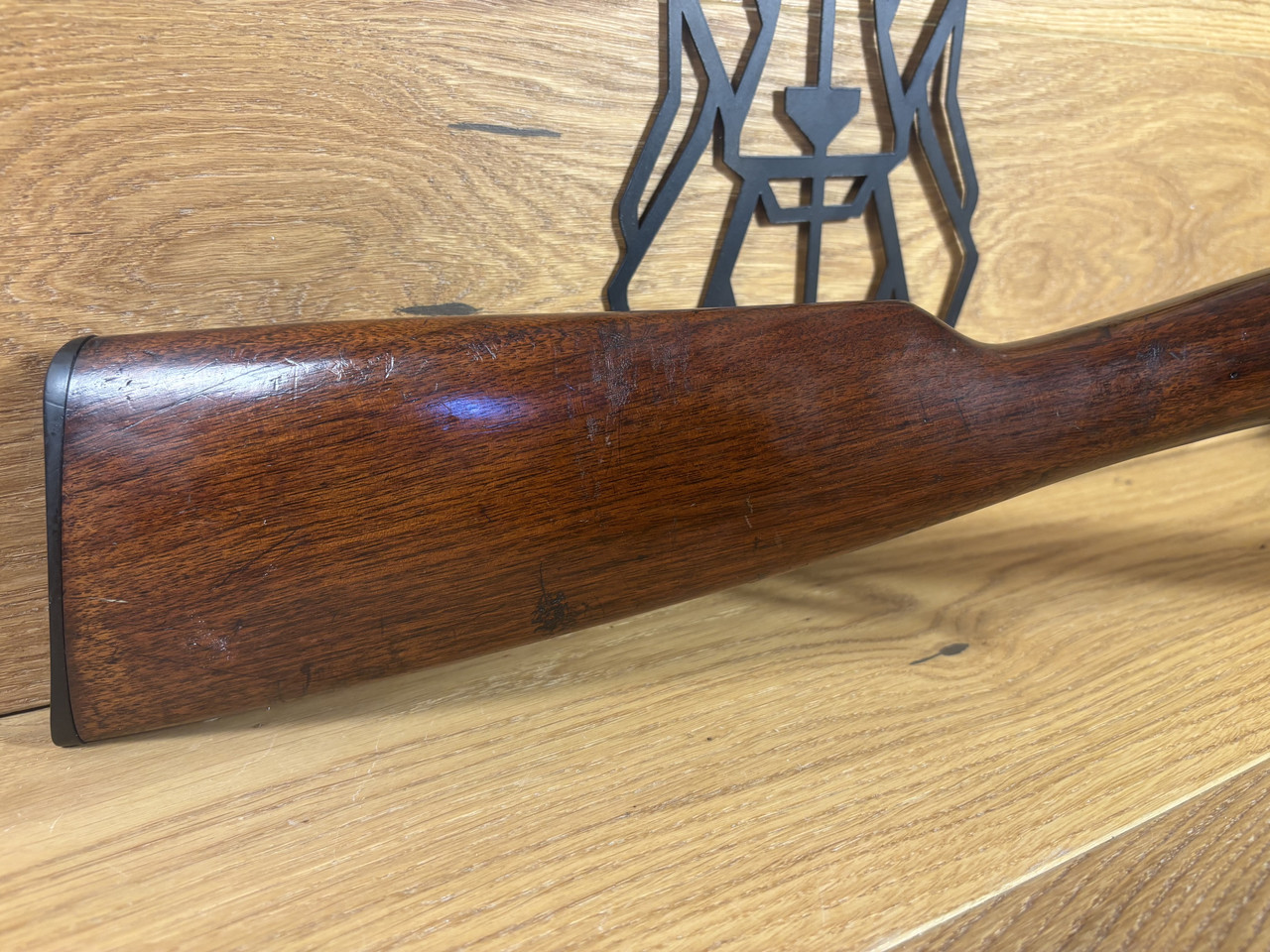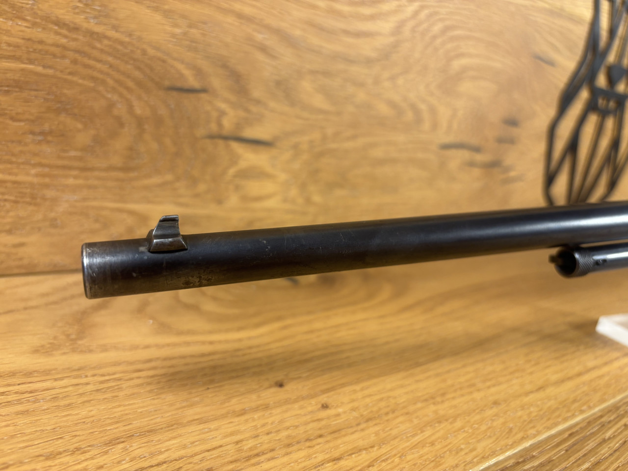 Kaliber: .22LR Model: Mod. 12 Lauflänge: ~ 55cm Magazin: 10 Schuss Felder und Züge sind abgenutzt, aber erkennbar. Die Waffe hat starke Gebrauchsspuren und leichte Roststellen im Lauf.