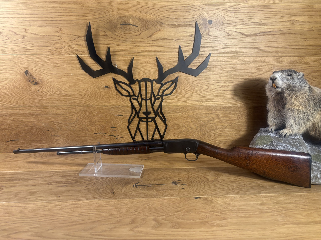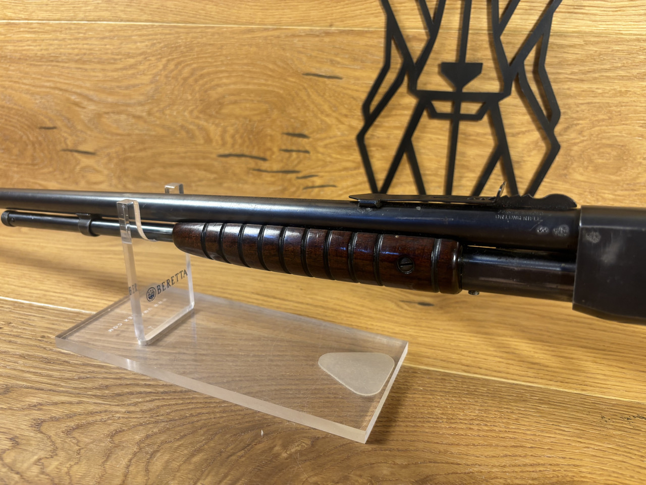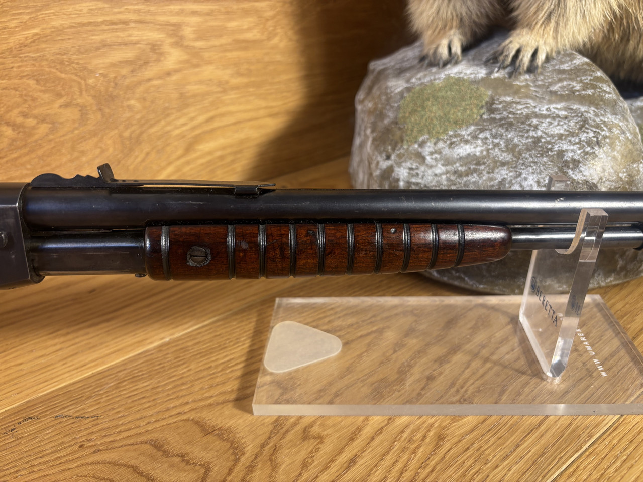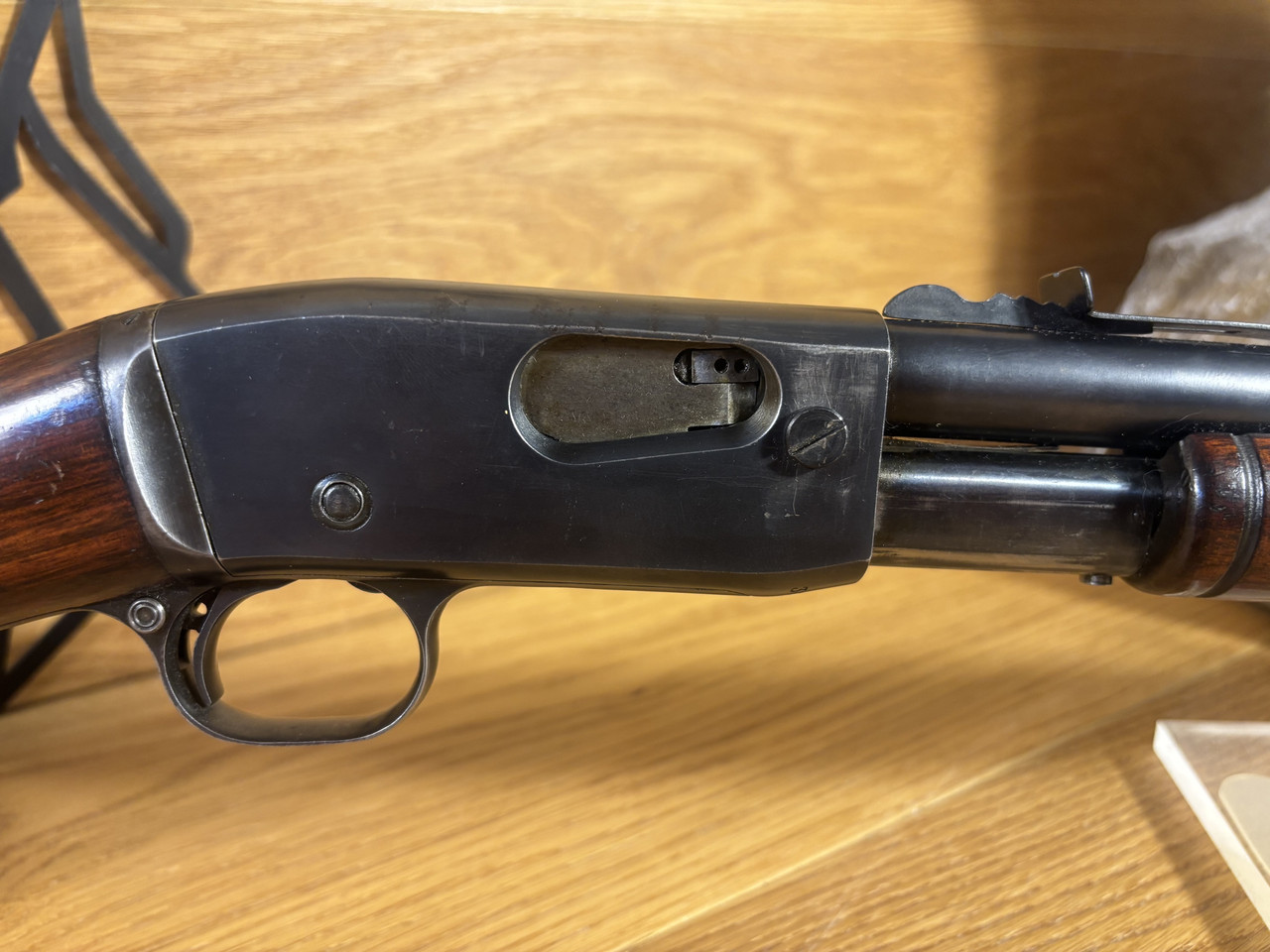Kaliber: .22LR Model: Mod. 12 Lauflänge: ~ 55cm Magazin: 10 Schuss Felder und Züge sind abgenutzt, aber erkennbar. Die Waffe hat starke Gebrauchsspuren und leichte Roststellen im Lauf.