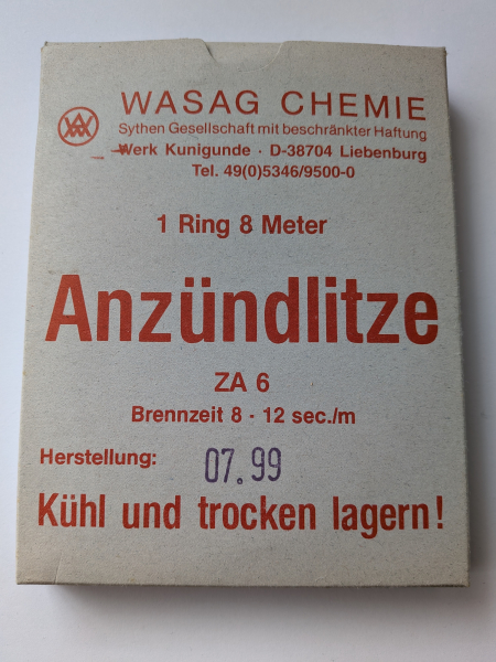 Anzündlitze, rot - der WASAG Chemie - 1 Ring 8 Meter - Brennzeit ca. 8 - 12 sec./m. Herstellung 07.99 - Wurde stets kühl und trocken gelagert! Versandkosten 6,50€-- Versand erfolgt unverzüglich nach Eingang des Betrages und Altersnachweis....und nun leider: es handelt sich hierbei um einen Privatverkauf, eine Rücknahme, Übernahme einer Gewährleistung oder sonstiger bestehender Pflichten und Gesetze ist hiermit ausgeschlossen.