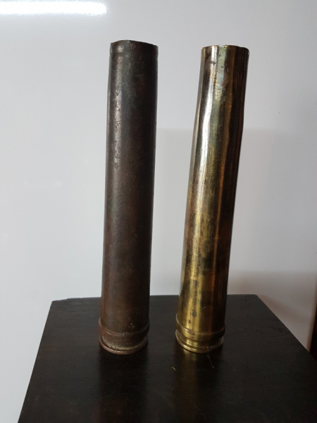2 GESCHOSSHÜLSEN WK II/ FLAK !! 1 x MESSING ( Kein Stempel gefunden), SOWIE 1 x KUPFER ( Stempel 1937 ). Stempel wurde mit grünem Stift markiert. Bitte Fotos ansehen, Privatverkauf, daher keine Garantie und keine Rücknahme, versicherter Versand mit DHL.