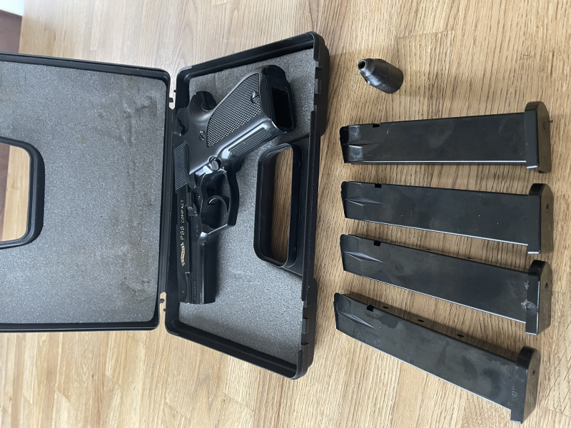 Gut erhaltene Walther P 88 aus Sammlungsauflösung. PTB 613 (10.6.1994). Sehr stabile, robuste Waffe von Walther, nicht Umarex. Keine Beschädigungen. Lieferung mit 4 (!!!) Magazinen á 10 Schuss, Original Walther Waffenkoffer, Signalbecher, Reinigungsbürste und 5 Patronen 9mm von Walther 2x Pfeffer und 3x Knall.