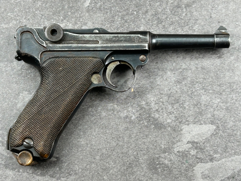Pistole 08, 9mmLuger, Erfurt 1918, komplett Nummerngleich inkl. Magazin, oben wurde wohl mal geschliffen--Erfurt und 1918 ist etwas flach, aber sonst in absolutem Originalzustand, --------- sehr selten mit Nummer gleichem Magazin!!!!!!!--Truppenstempel an der Vorderseite des Griffstückes--------siehe Bilder---------