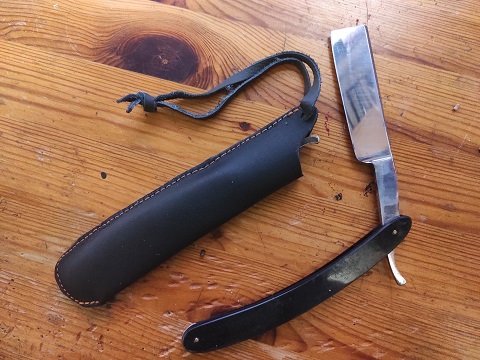 Nachbau eines Rasiermessers , geschmiedet , authentisches Rasiermesser , sehr scharf und bedarf deshalb der Übung um damit zu barbieren 😉 , Anfänger üben sicherheitshalber an einem Luftballon …… incl. Lederetui , Griffschalen aus Horn