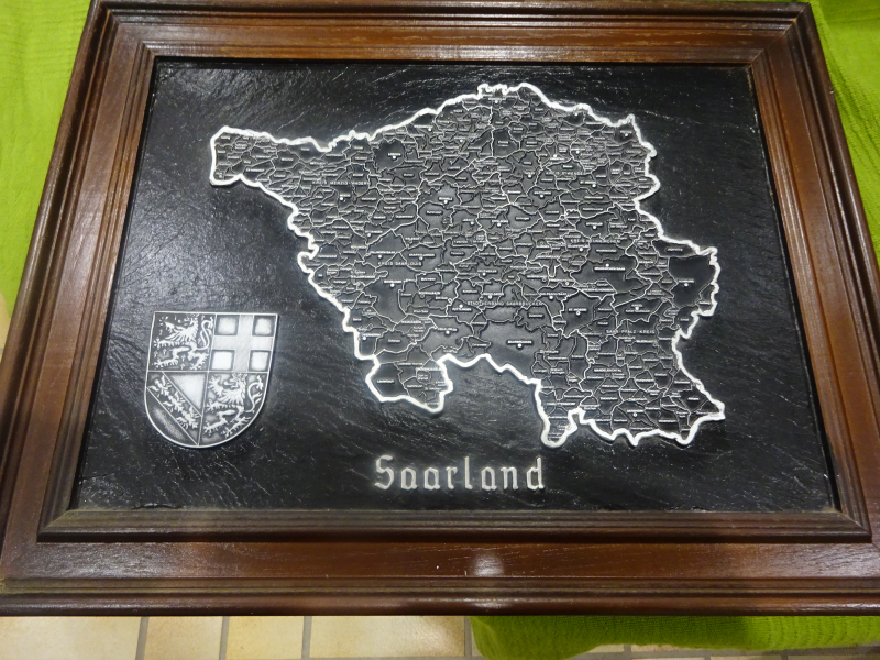 etwas für Saarlandfans: eine Reliefkarte des Saarlandes mit allen 52 Gemeinden, hergestellt aus einem schweren Kohlenstück, versilbert von einem Juwelier aus dem Saarland, dessen Marke aud der Rückseite, in holzfarbenem Rahmen, Größe 37x47 cm, Gewicht ca. 5 kg, so wohl ein seltenes Sammlerstück, es muss vorsichtig transportiert werden, daher ist eine Abholung vorgesehen