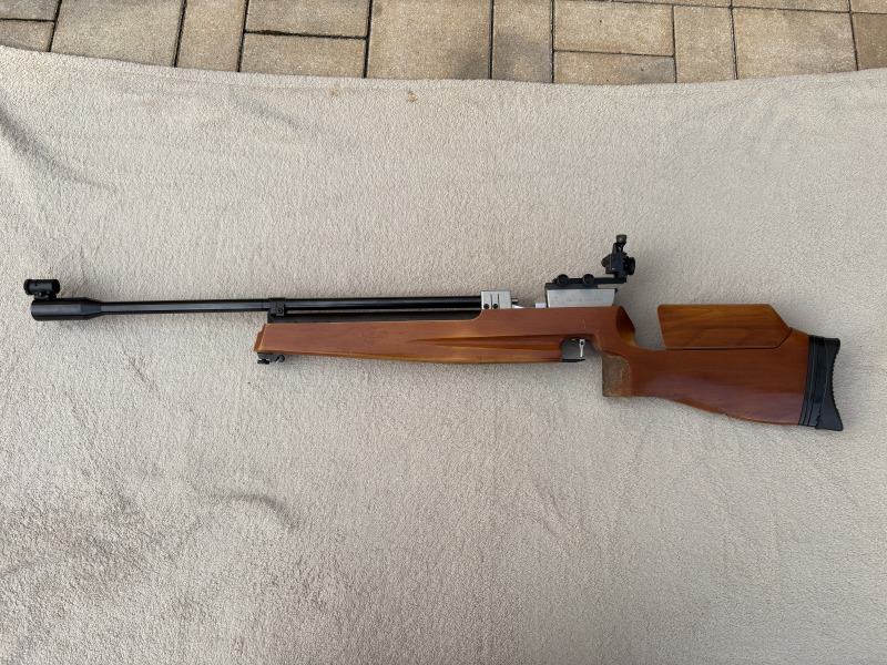 Verkaufe hier aus Sammlungsauflösung ein Haenel Matchlufthewehr554/M aus Suhl.Das Luftgewehr ist ein Seitenspanner und schiesst mit vorkomprimierter Luft und schiesst deshalb prellsxhlagsfrei.Zu DDR-Zeiten das beste was auf dem Markt zu bekommen war.Der Druck ist gut,der Schaft hat ein paar Gebrauchsspuren.Die Brünierung ist im guten Zustand.Das Luftgewehr ist vor 1990 hergestellt und somit frei verkäuflich.
