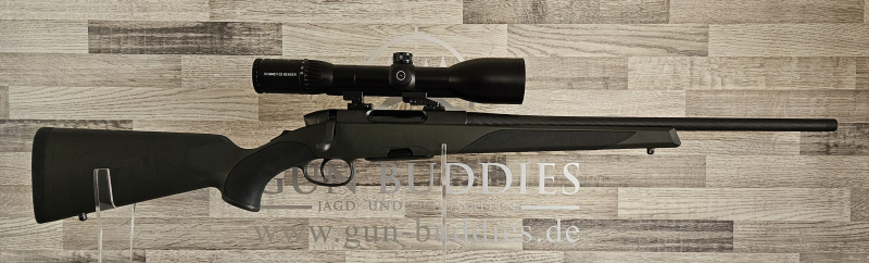 Als einsatzfertiges und hochwertiges Set, montiert mit einem Zielfernrohr Schmidt & Bender T96 Polar 3-12x54 P LMZ 2.BE D7 mit Zeiss-Innenschiene und Parallaxeverstellung, auf einer RUSAN-Schwenkmontage plus Gun Buddies Neopren-Gewehrriemen in olivgrün.