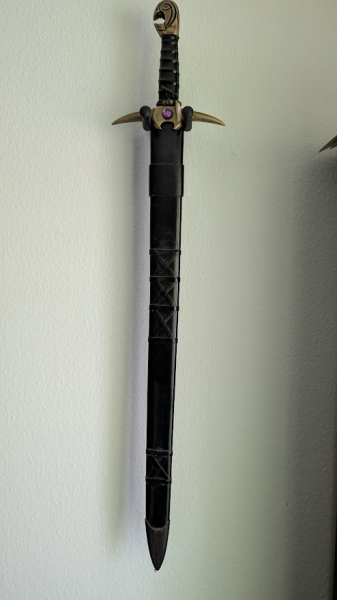 Um den Griff, an der Parierstange ist ein Wolfszahn befestigt, kann auf Wunsch entfernt werden.