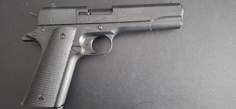 Icj verkaufe folgende Schreckschußpistole: Colt Government 1911 A1, Cal. 9mm. Zustand bitte den Bildern entnehmen. An der rechten Seite des Schlittens ist ein Oberflächenkratzer. Die Waffe schießt einwandfrei.