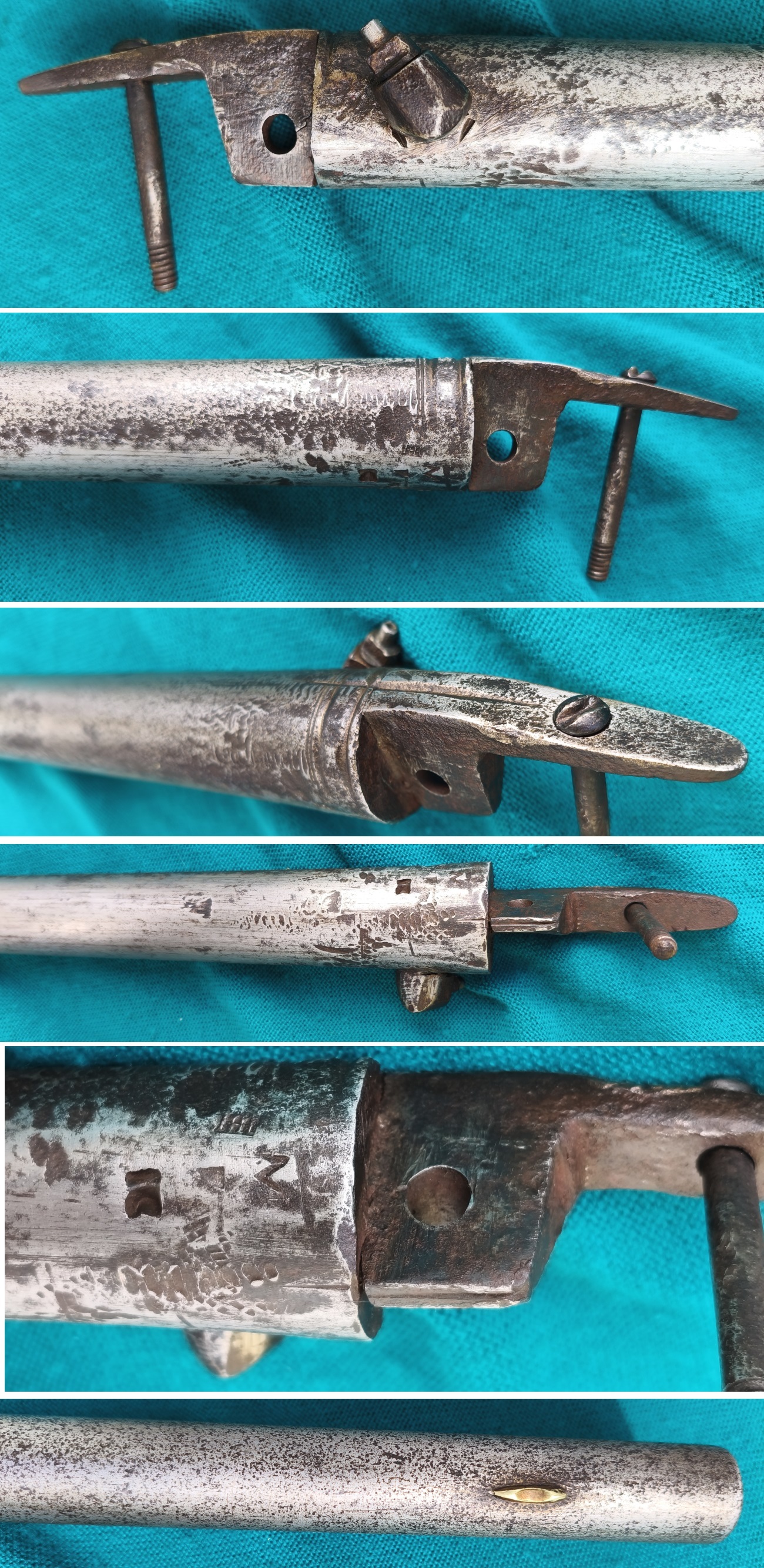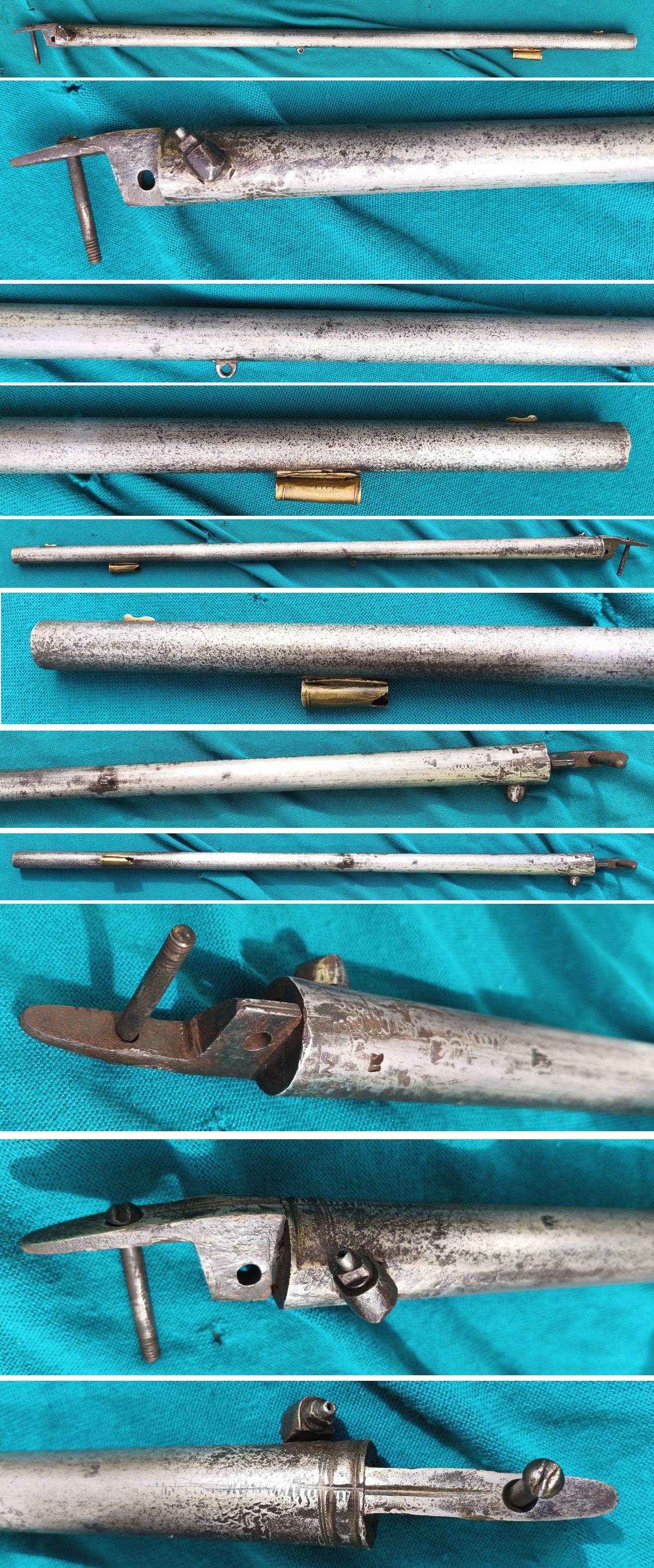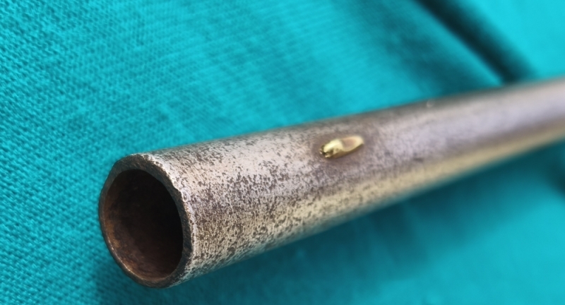 Schwerer militärischer Steinschloßlauf, 18 Jahrhundert, alt auf Perkussion aptiert. Laufunterseite geschlagene Marken, vorne eingesetztes Messingkorn, hinten eingeschlitzte flache Kimme. Kal. 18,39mm glatt. Lauflänge 78,3cm, mit Schwanzschraubenblatt 85,3cm. Fundzustand, ungereinigt, Alters- & Gebrauchsspuren, Siehe Fotos.