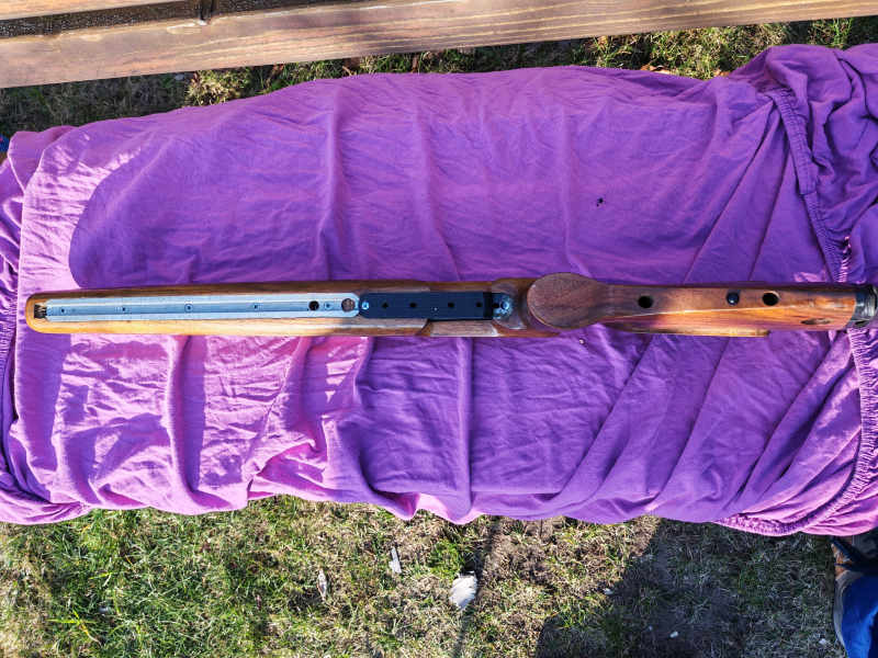 War an einer Suhl M150 verbaut. Gehört aber wahrscheinlich an eine Anschütz. Der Schaft wurde recht grob angepasst.