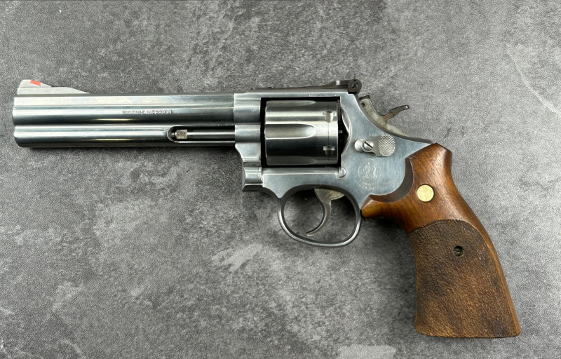 Smith & Wesson Revolver, Kal. 357Magnum, 6 Schuß, 6 Zoll Lauf, stainless, das gute Modell 686-4, schon ein paar Jahre alt--aber top in Schuß mit blankem Lauf. Holzgriffschalen vorne ein wenig ausgebrochen--merkt man gar nicht beim angreifen.