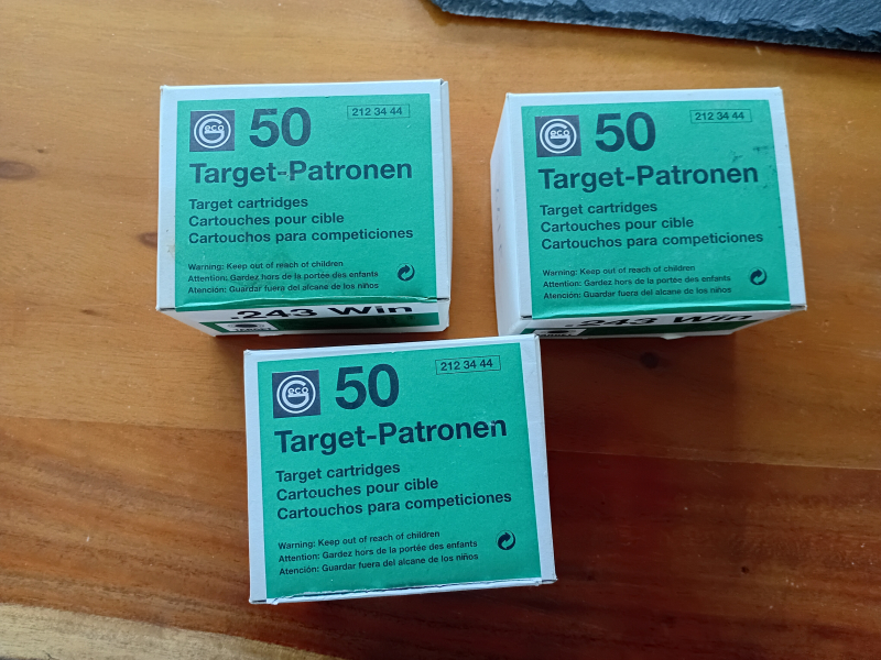 Hallo, verkaufe 3 x Packungen a`50 Schuss = 150 Patronen Geco Kaliber .243. Die Munition ist aus einem Los. Privatverkauf,