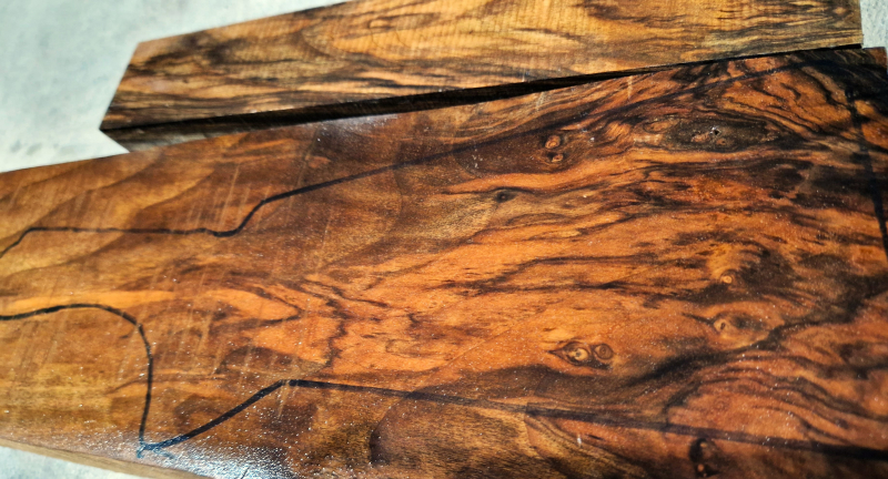 Die ersten Aufnahmen entstanden auf einem leicht angefeuchteten Holzbrett, um die Farben und die Schönheit des fertigen Produkts realistischer darzustellen. Das letzte Bild zeigt die Maße in Zentimetern. Die Konturen wurden auf die tatsächlichen Abmessungen der Blaser F3 übertragen. Die Teile wurden fünf Jahre lang luftgetrocknet. Auf Dampftrocknung wurde verzichtet, um die Farben und die natürlichen Harze des Holzes zu erhalten. Das Ergebnis ist ein elastischerer, festerer und schönerer Schaft