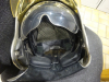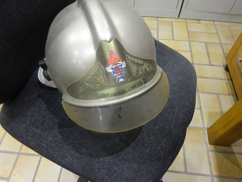 selten: großer Helm eines Feuerwehrhauptmannes der Luxemburger Feuerwehr von 1980 mit besonderen Funktionen, Nackenschutz , Schutzvisier und als besonderheit eine abklappbare Schutzbrille integriert im Helm, mit voller Innenausstattung, versilbert zur Wärmeableitung, in sehr gutem gebrauchtem Zustand, halt ein Original, so kaum zu bekommen