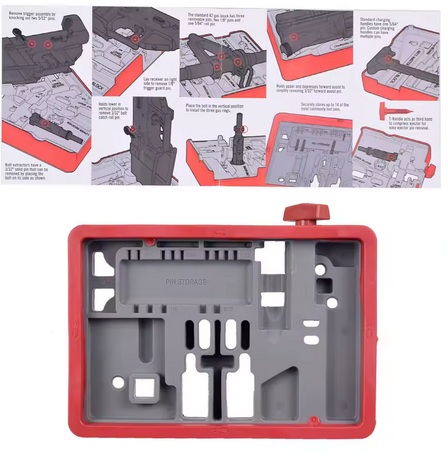 Vielseitige Anwendung: Der Block hält bis zu 5 verschiedene AR15-Komponenten in 8 unterschiedlichen Positionen, wodurch das Entfernen und Einsetzen von insgesamt 13 kritischen Pins und Gasringen erleichtert wird.