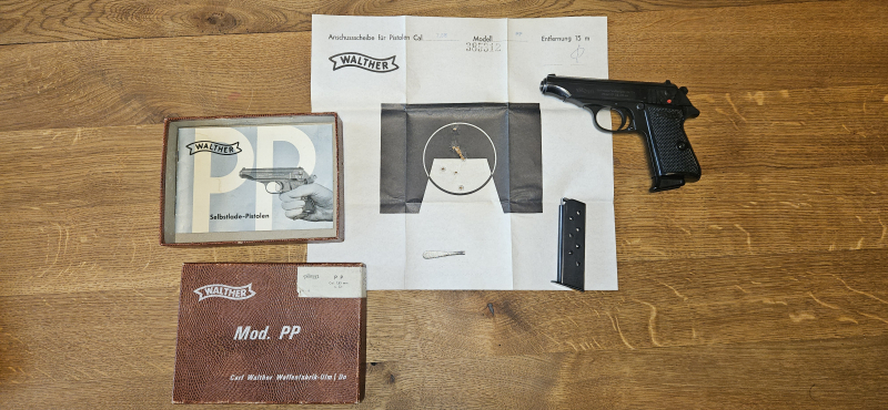 Walther PP Pistole Kal. 7,65 mm – Top Zustand – nummerngleich mit Karton & Anschussbild – Sammlerstück Zum Verkauf steht eine originale Walther PP Pistole im Kaliber 7,65 mm Browning in sehr gepflegtem Zustand. Es handelt sich um ein besonders schönes und sammelwürdiges Stück, da Seriennummer der Waffe mit dem originalen Karton sowie dem Anschussbild übereinstimmt (nummerngleich!) – ein seltenes und begehrtes Merkmal für Sammler. Highlights: Original Walther PP Kaliber 7,65 mm Browning (.32 ACP) Sehr guter Zustand (siehe Bilder) Seriennummer 385312 (nummerngleich auf Waffe & Karton) Original Walther Karton vorhanden Original Anschussbild / Schussbild enthalten 2 Magazine im Lieferumfang Lieferumfang: Walther PP Pistole 2 originale Magazine Original Karton (nummerngleich) Original Anschussbild / Schussbild Dokumente / Unterlagen wie abgebildet Zustand: Die Pistole befindet sich in einem sehr gepflegten Zustand mit nur leichten Gebrauchsspuren. Technisch einwandfrei. Lauf und Mechanik sauber. Das originale Zubehör (Karton + Anschussbild) ist ebenfalls gut erhalten. Besonderheit: Komplett nummerngleiches Set inkl. originalem Karton und Anschussbild – ideal für Sammler und Liebhaber klassischer Walther Pistolen.
