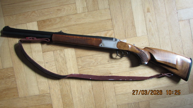 Hohwertige kombinierte Jagdwaffe, sehr sicher und führig, ein-Schloss-Spannsystem, Auszieher, Spannschieber auf dem Kolbenhals, bay. Backe, der Oberhebel steht noch rechts, demzufolge ist der Verschluss auch noch sehr stramm und dicht, mit Kimme und Korn, gültiger Beschuss von 1997 ist vorhanden, Riemenbügelösen und Riemen, die Neopreneschaftkappe zeigt Standspuren und müsste getauscht werden.