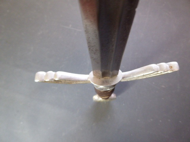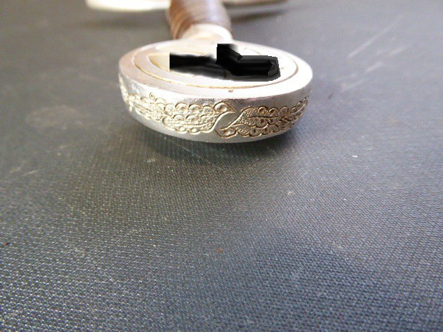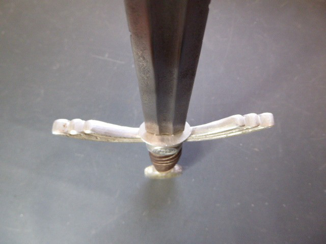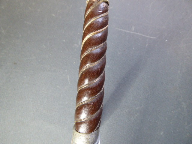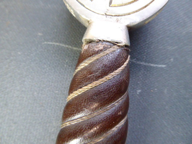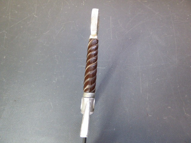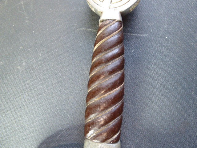 Aus meiner Sammlung gebe ich, ein Originales 3. Reich Luftwaffenschwert Hersteller WEIERSBERG u.Co SOLINGEN ohne Scheide ab. Original Griff Holz mit Leder ummantelt und Draht Wicklung. Knauf und Parierung aus Aluminium, teilweise sieht man noch die Vergoldung an den Kreuzen, der Griffring ist einseitig mit Bruch. Zweischneidige Klinge beidseitig mit Kehlungen, Hersteller WEIERSBERG u.Co SOLINGEN. Das Teil ist im Sammelwürdigen Zustand. Alles andere entnehmen Sie Bitte den Fotos. Gesamtlänge: 88 cm, Klingenlänge: 70,8 cm, Klingenbreite: 2,5 cm. Kann zu jederzeit bei mir besichtigt werden. Privatauktion keine Rücknahme und Garantie.