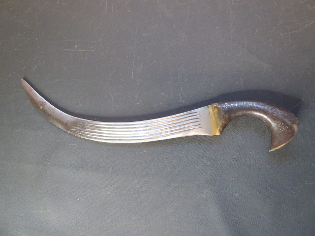 Aus meiner Sammlung gebe ich, einen alten mir unbekannten Stark gekrümmten Dolch mit Silbertauschierten Eisengriff ohne Scheide ab. Kenner werden es sicherlich wissen, wo das Teil getragen wurde. Griff aus mehrteiligen Eisenblech Silbertauschiert. Breite Stabile einschneidige Klinge beidseitig mit 6 Kehlungen, an der Spitze dicker werdend. Leider ohne Scheide. Das Teil ist im Guten Sammelwürdigen Zustand. Alles andere entnehmen Sie Bitte den Fotos. Gesamtlänge: 46,5 cm, Klingenlänge: 36,5 cm, Klingenbreite: 4,7 cm. Kann zu jederzeit bei mir besichtigt werden. Privatauktion keine Rücknahme und Garantie.