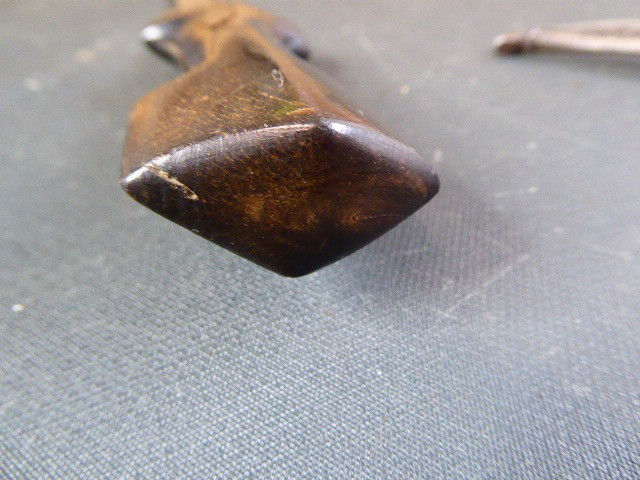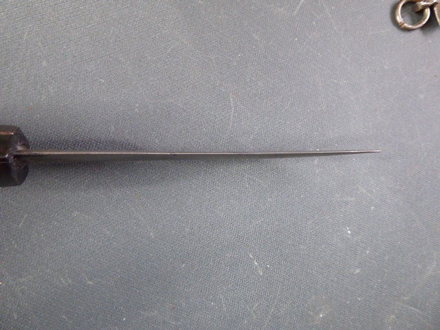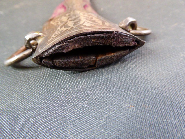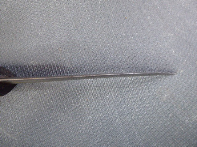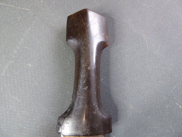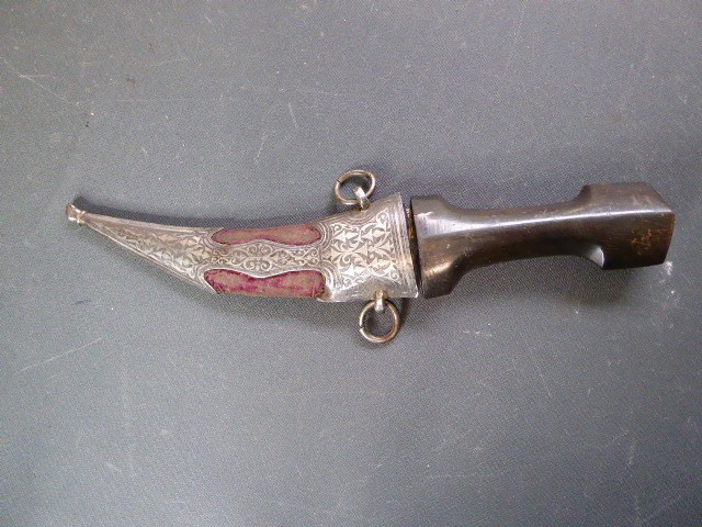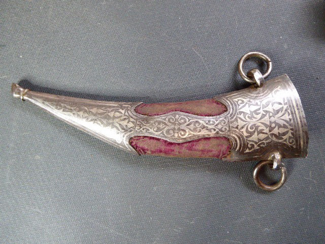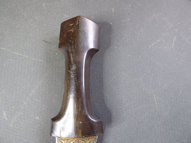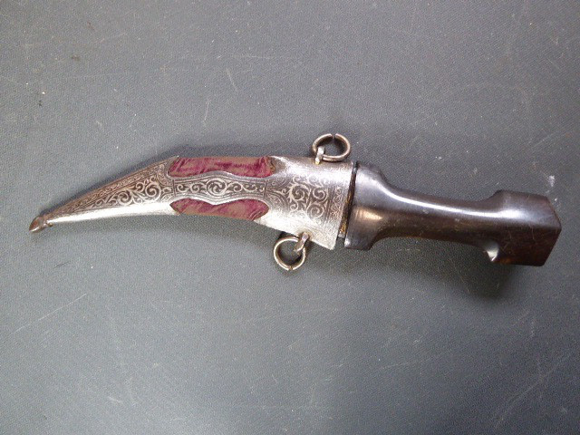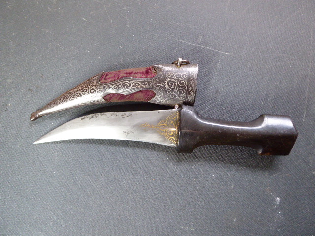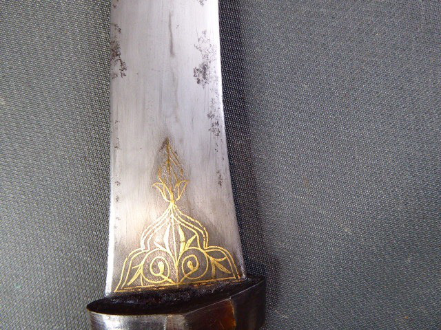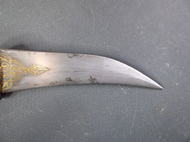 Aus meiner Sammlung gebe ich, einen alten mir unbekannten Orientalischen Dolch mit Goldtauschierter Klinge und Scheide ab. Kenner werden es sicherlich wissen, wo das Teil getragen wurde. Griff aus einem Stück Horn. Breite Stabile zweischneidige Klinge, mit leichtem Mittelgrad beidseitig mit Goldtauschierungen, Klinge sieht aus wie Damast, aber nicht geprüft. Sehr interessante Scheide, Holz mit rotem Samt ummantelt, der Samt schon etwas zerschlissen, dann noch komplette Eisenbeschläge mit Silbertauschierungen, oben zwei Trageringe. Das Teil ist im Guten Sammelwürdigen Zustand. Alles andere entnehmen Sie Bitte den Fotos. Gesamtlänge: 26,5 cm, ohne Scheide: 24,3 cm, Klingenlänge: 14 cm, Klingenbreite: 3,5 cm. Kann zu jederzeit bei mir besichtigt werden. Privatauktion keine Rücknahme und Garantie.