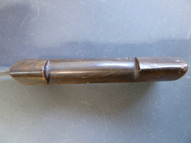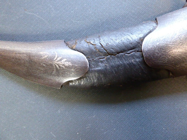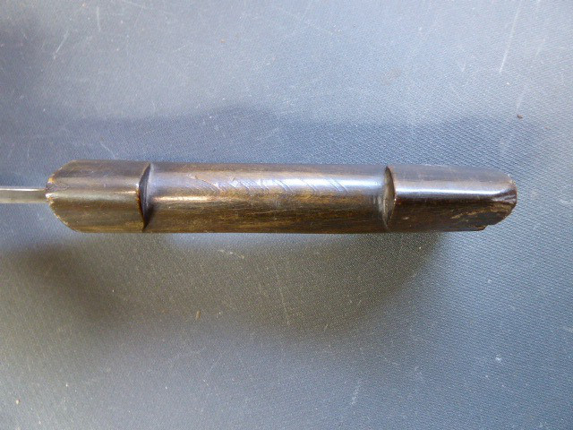 Aus meiner Sammlung gebe ich, einen alten mir unbekannten Orientalischen Dolch mit Scheide ab. Kenner werden es sicherlich wissen, wo das Teil getragen wurde. Griff aus einem Stück Horn. Breite Stabile zweischneidige Klinge, mit starkem Mittelgrad, könnte Damast sein aber nicht geprüft. Scheide, Holz mit Leder ummantelt, mit zwei Eisenbeschläge mit Silbertauschierungen, oben zwei Trageringe. Das Teil ist im Guten Sammelwürdigen Zustand. Alles andere entnehmen Sie Bitte den Fotos. Gesamtlänge: 35,5 cm, ohne Scheide: 34 cm, Klingenlänge: 19,5 cm, Klingenbreite: 4,9 cm. Kann zu jederzeit bei mir besichtigt werden. Privatauktion keine Rücknahme und Garantie.