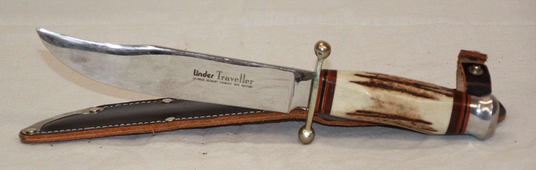 1 x LinderTraveller, Solingen, mit Lederscheide. Total 25,5 cm. Klinge 15,3 cm. Gewicht 172 Gramm.