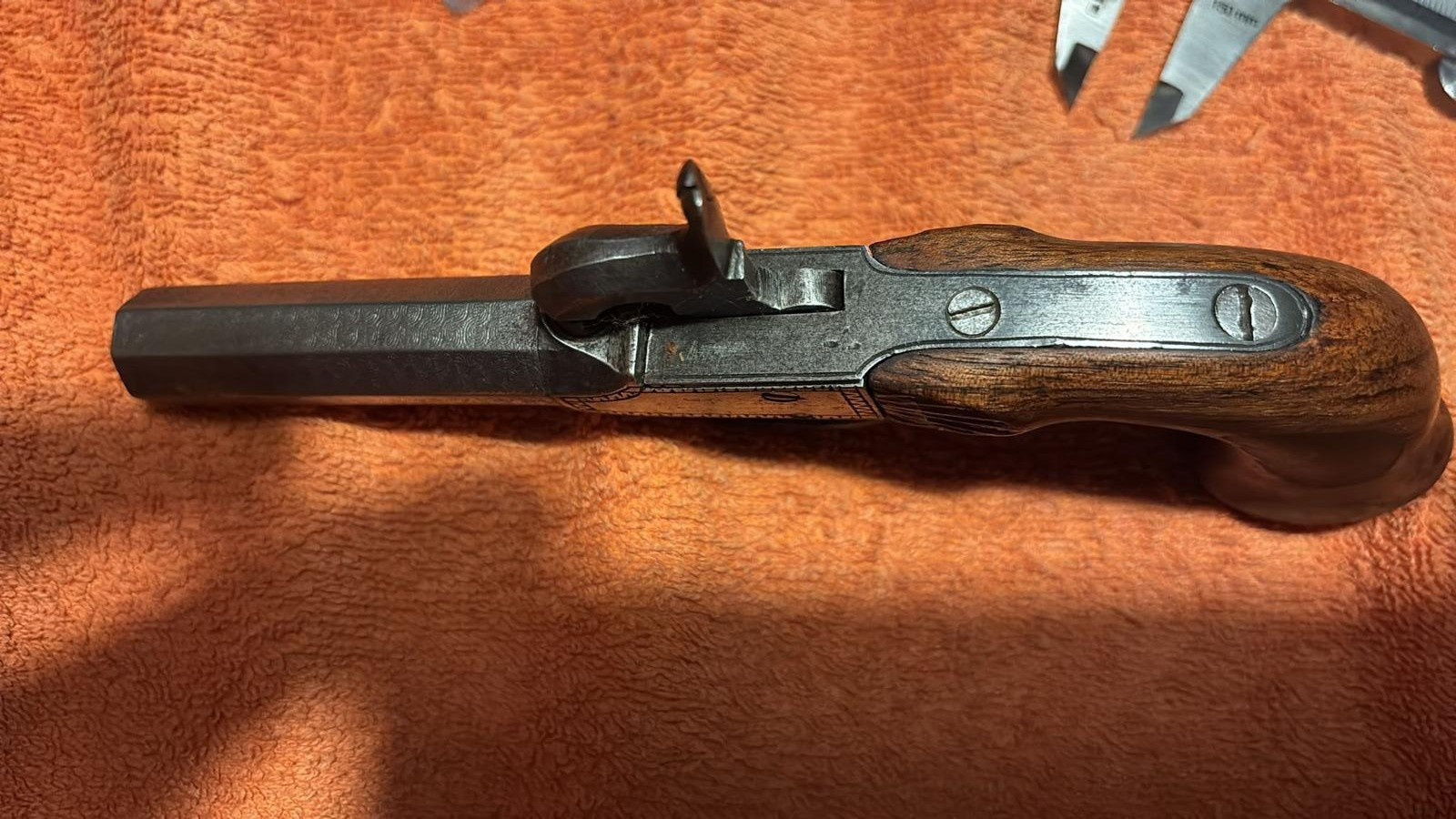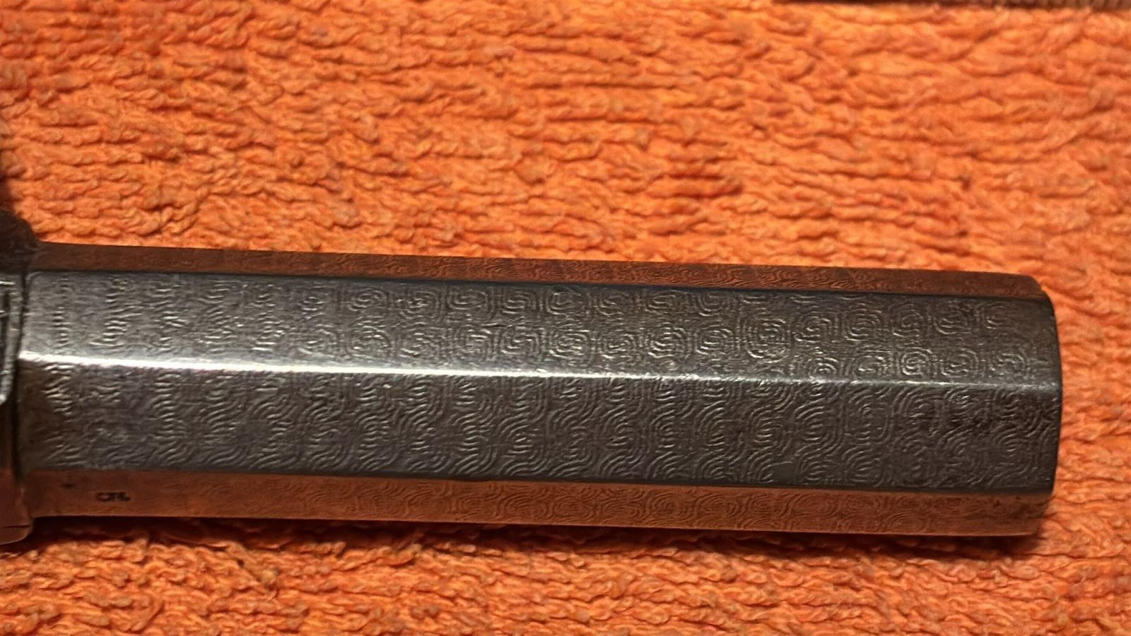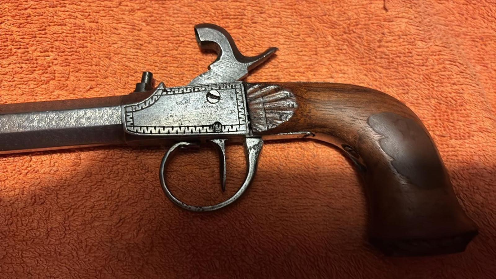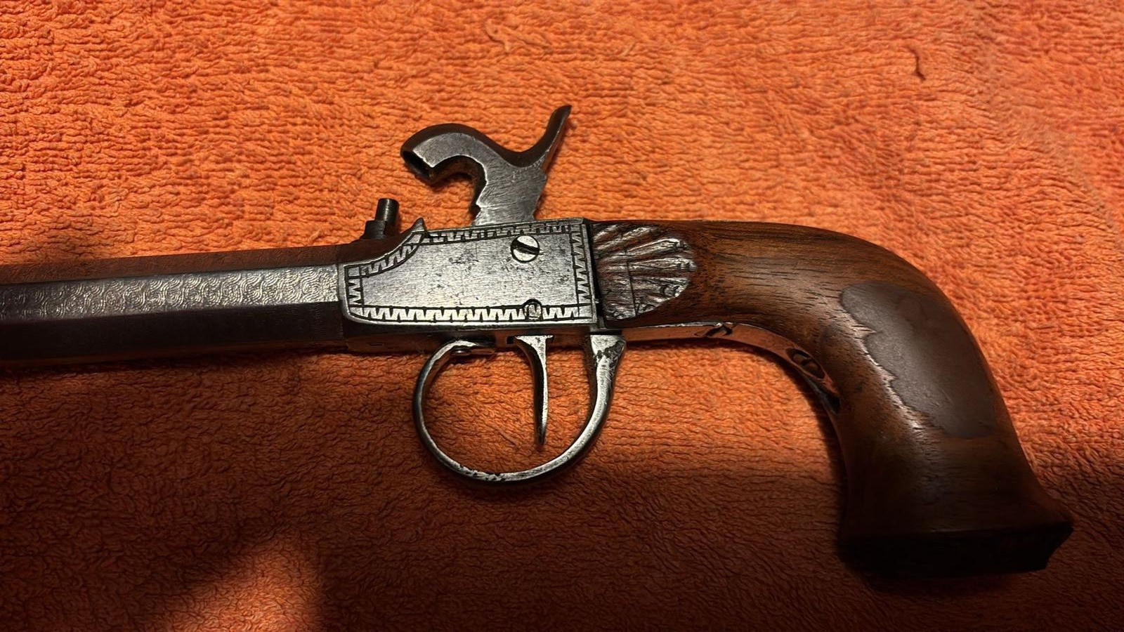 Diese alte Vorderlader Pistole - Perkussion - ist für mich im guten Zustand. Der Lauf bei der Pistole ist aus Damaszener Stahl.