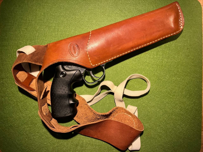 Schulterholster Rechtshand, Träger aus weichem, bequemen Wildleder mittels Lederschnuren einstellbar und stufenlos einstellbare Schlinge aus Gummiband, geschlossen am Lauf, mit einer innen verbauten Stahlklemme als einzige Waffensicherung.