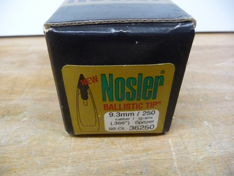 Hier wird z.B. eine geschlossene Packung mit 50 Stück Nosler Geschossen, 9,3 mm, 250 grain, Ballistic Tip angeboten.